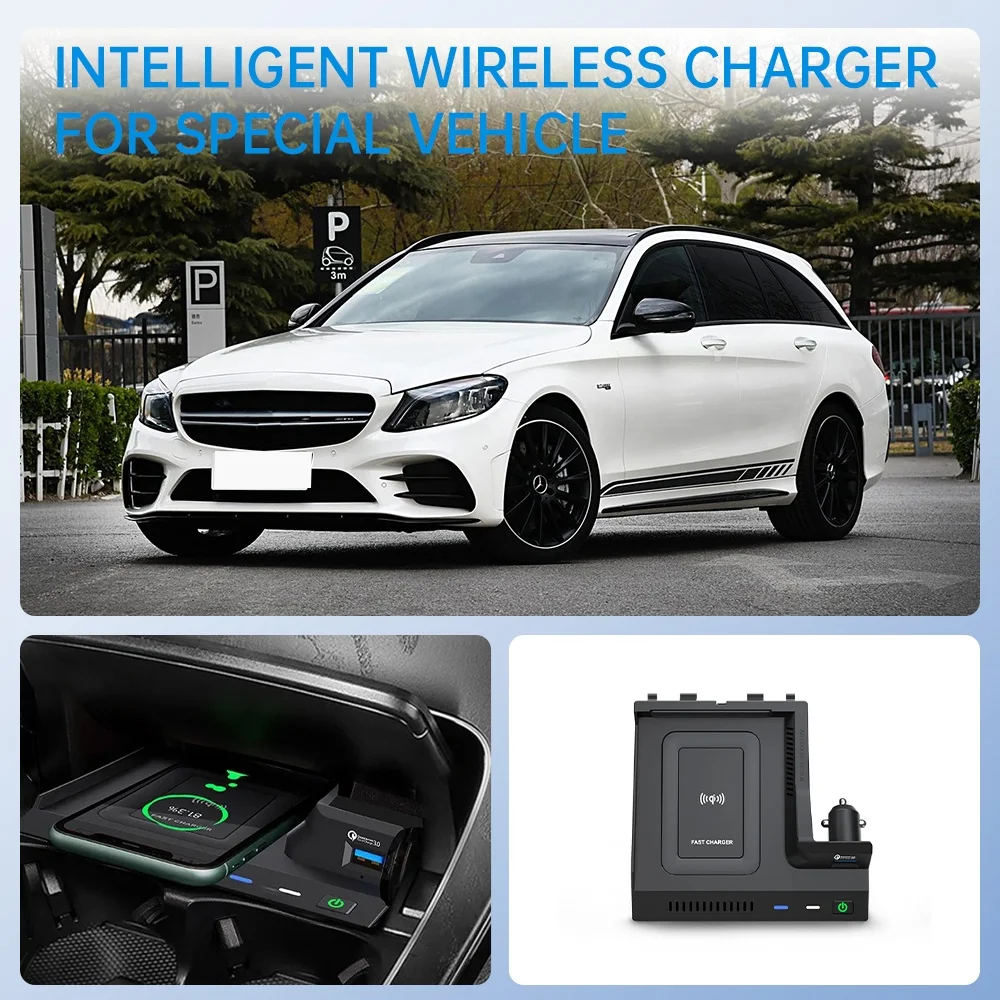 Chargeur sans fil voiture Qi 15W charge rapide Mercedes W205 GLC 2014 2023 console accoudoir ABS noir mat