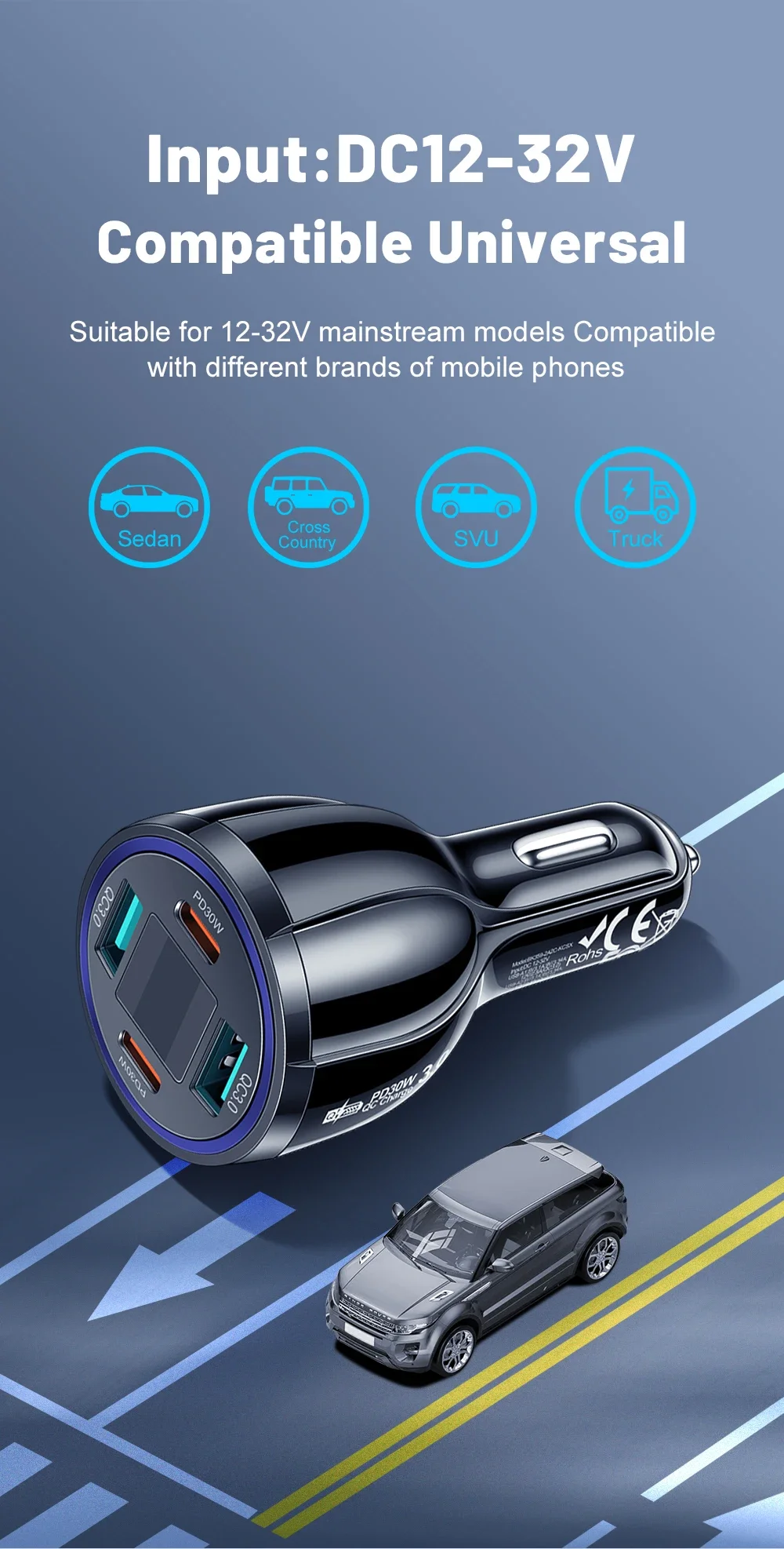 Le chargeur de voiture 100W 4 ports PD charge rapide chargeur de téléphone adaptateur de type C dans la voiture! Ce chargeur est parfait pour ceux qui sont toujours en déplacement et qui ont besoin d’une solution de charge fiable et rapide pour leurs téléphones.