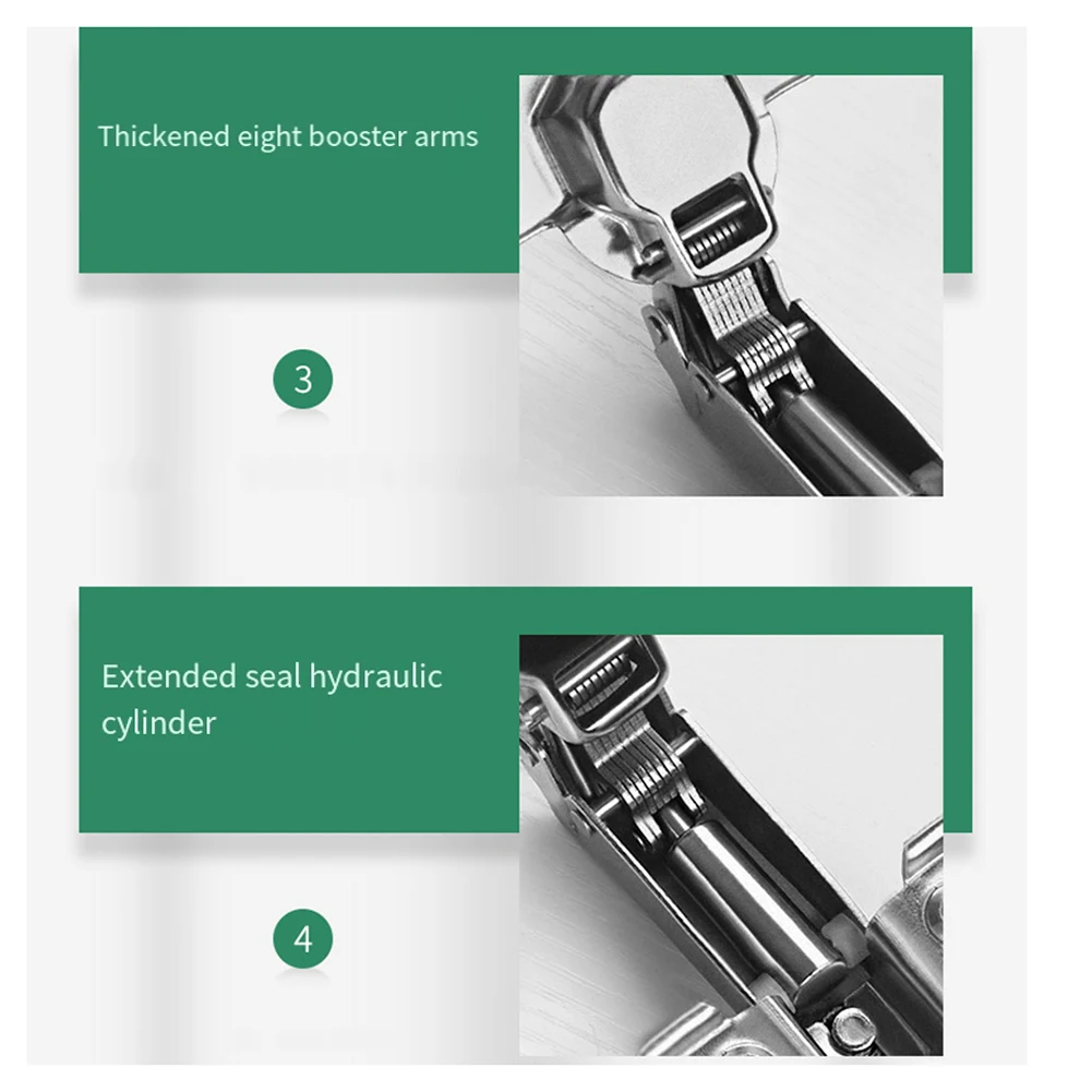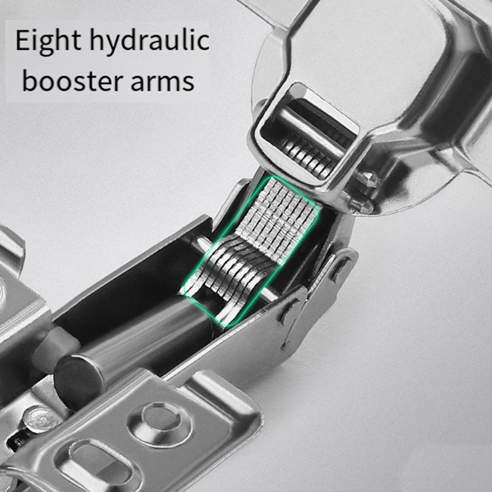 * Équipé de huit bras d’assistance hydraulique, cette charnière assure un mécanisme de fermeture et d’ouverture silencieux et à action lente.