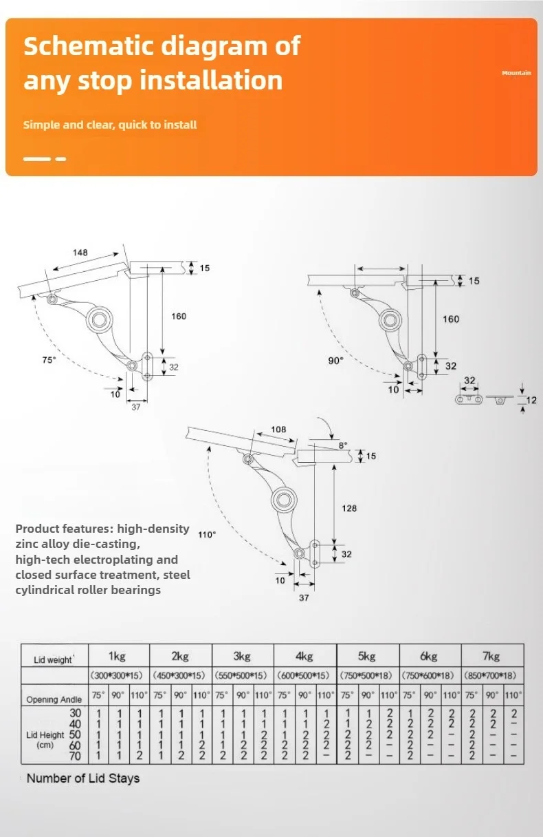 Charnières hydrauliques d’arrêt aléatoire, porte d’armoire de cuisine, charnière polie réglable, rabat de levage de meubles, matériel de Support
