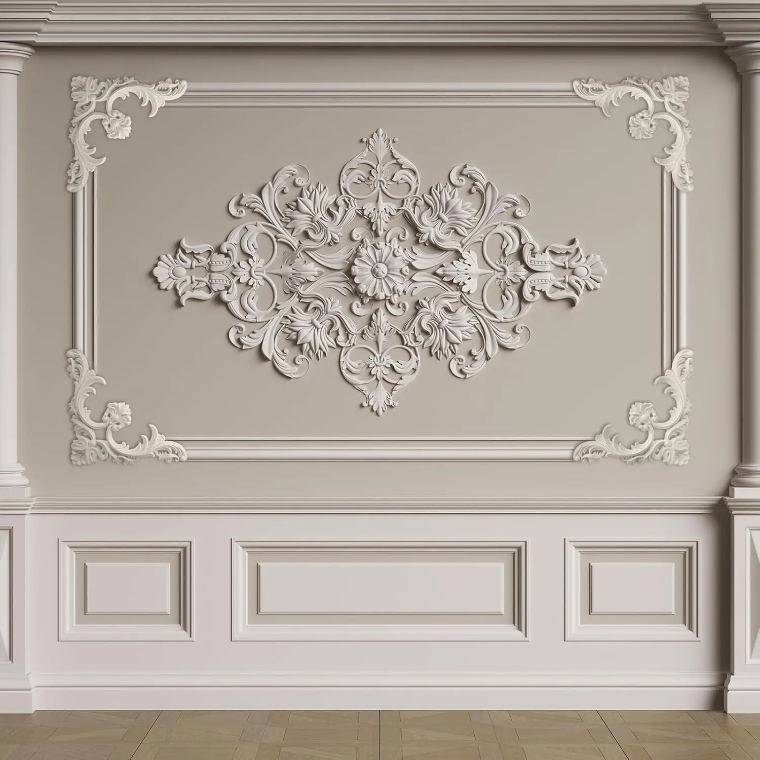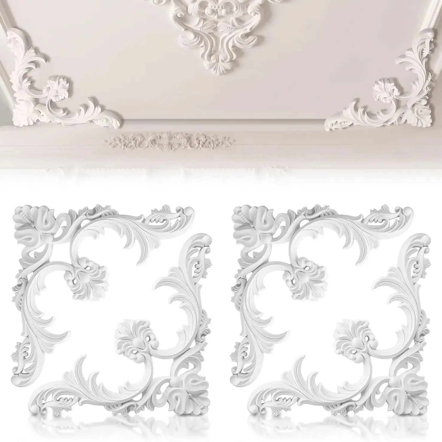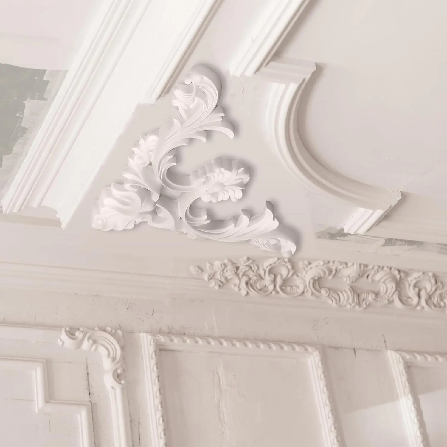 Décoration d’angle de plafond blanc présentant un motif exquis.Ces ornements ajouteront un style européen élégant et charmant à votre maison, créant une toile de fond captivante pour les ventilateurs de plafond et les luminaires.