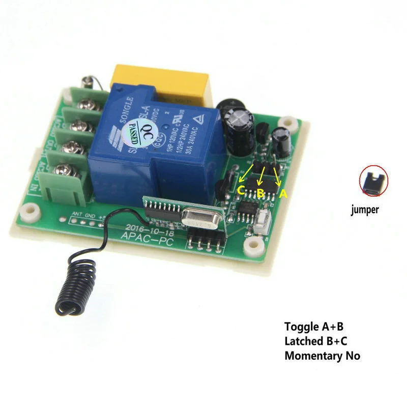 Gardez le pressage d’un bouton fonctionne/ON.desserrer votre doigt est arrêter/arrêt. L’interrupteur (récepteur) à 1 canal nécessite une télécommande à 1 bouton (émetteur)