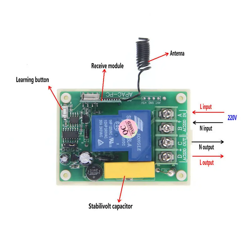 Gardez le pressage d’un bouton fonctionne/ON.desserrer votre doigt est arrêter/arrêt. L’interrupteur (récepteur) à 1 canal nécessite une télécommande à 1 bouton (émetteur)