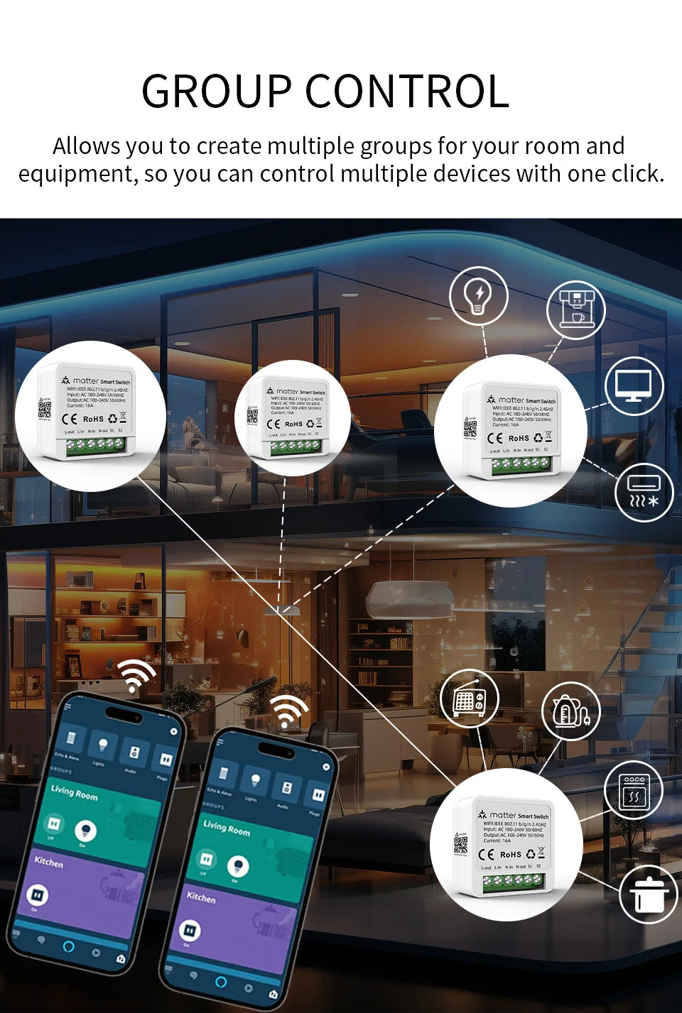【Conseils importants】commutateur wifi ne prend en charge que le réseau WiFi 2.4GHz et IPv6. Le contrôleur certifié Matter (HomePod, Echo, Nest, SmartThings Hub) est nécessaire pour contrôler l’ampoule Matter dans les plates-formes Home/Alexa/Google Home/SmartThings.
