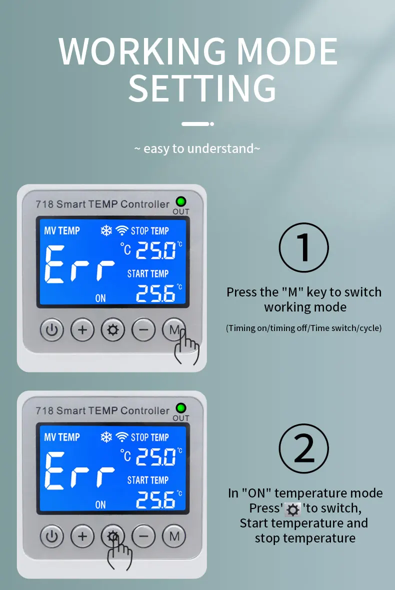 Il existe cinq modes de fonctionnement : « marche », « minuterie activée », « minuterie désactivée », « minuterie » et « cycle », qui ont tous des fonctions de contrôle de la température.