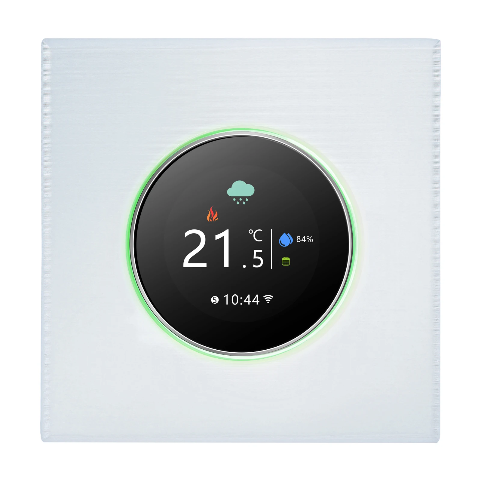 【Thermostat intelligent Wi-Fi 】 Conception murale ultra-mince du corps et des boutons, facile à installer et simple à utiliser. Compatible avec 86*86mm carré ou boîte d’installation ronde européenne 60mm. Avec écran TFT pour afficher des informations sur la météo, l’humidité extérieure, la température, l’horloge, etc., et la lumière ambiante en 3 couleurs augmente la couleur de votre vie.