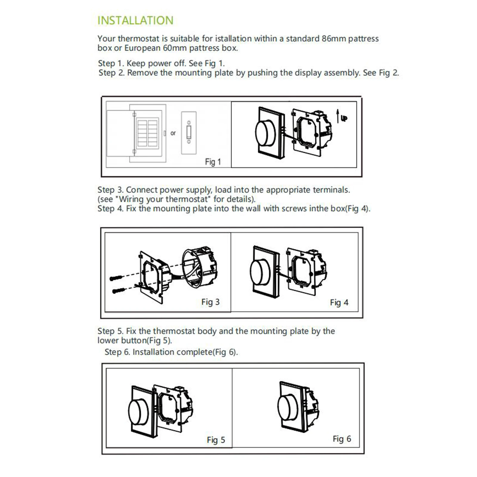 Consommation électrique: <1.5W Boîte d’installation: 86*86mm carré ou boîte ronde européenne de 60mm Taille de l’article: 8.6*8.6/ 3.4*3.4in Poids de l’article: 160g/ 5.6oz Liste d’emballage 1 * Thermostat 2 * Vis 1 * Manuel d’utilisation (Englis)