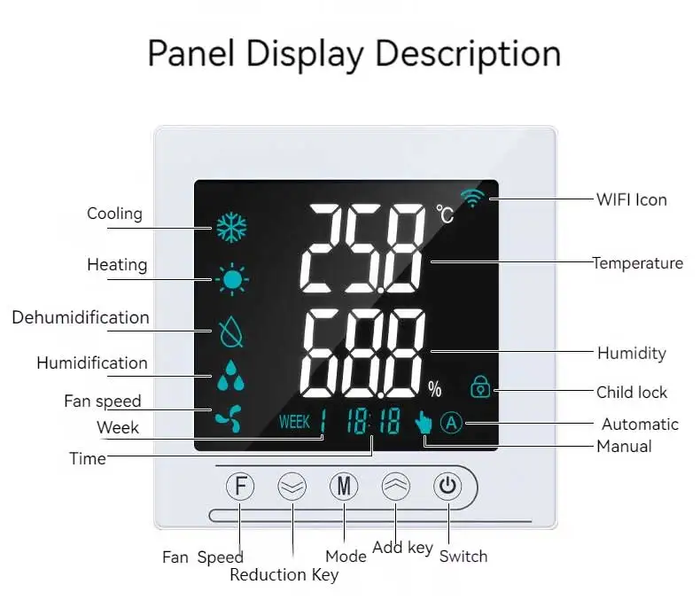 L’affichage à cristaux liquides grand écran est adopté et l’état d’affichage à cristaux liquides comprend : température intérieure, humidité intérieure, vitesse du ventilateur, fonctionnement du travail de programmation, etc.