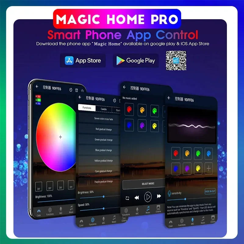Fonction : Mode scénes, Mode musique, Fonction minuterie, 100 modèles de changement, Personnalisez vos propres effets