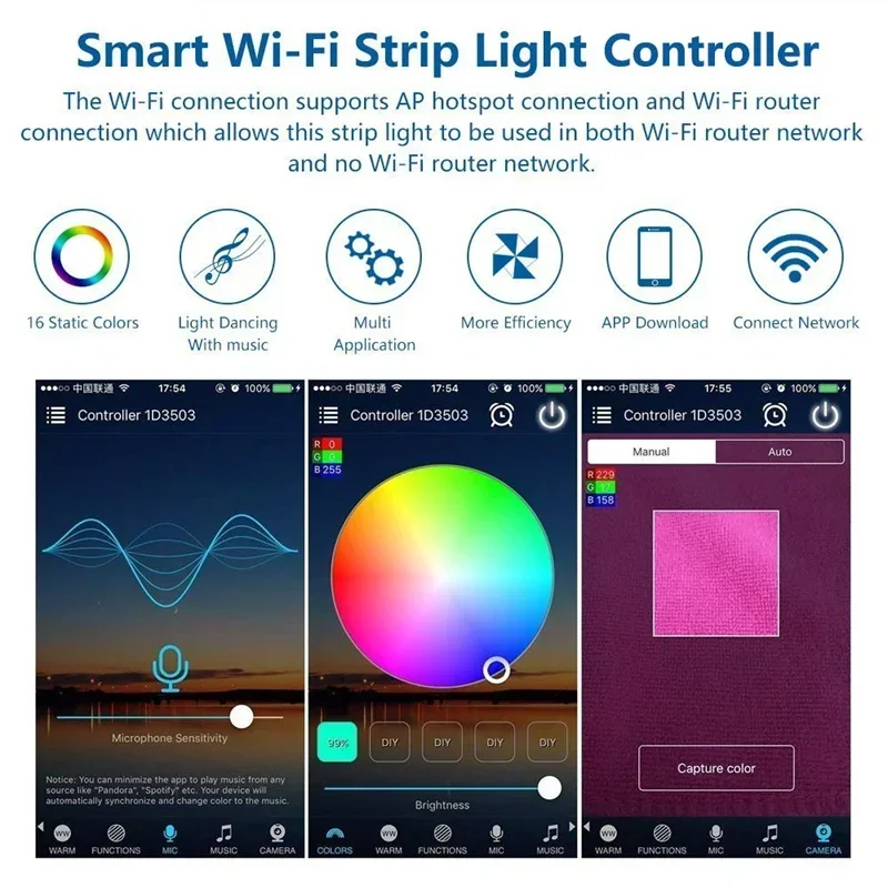 Caractéristiques spéciales :Minuterie et variateur, compatible avec Alexa/Google Assistant, contrôle APP, télécommande, danse couleur avec rythme musical