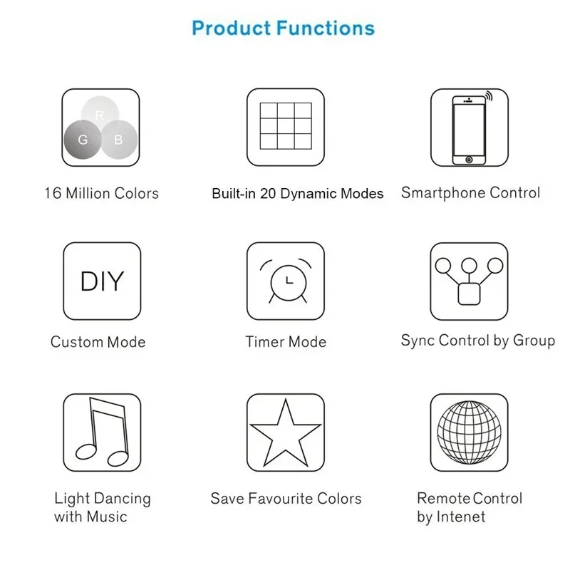 Fonction : mode scènes, mode musique, fonction minuterie, 100 modèles de changement, personnalisez vos propres effets.