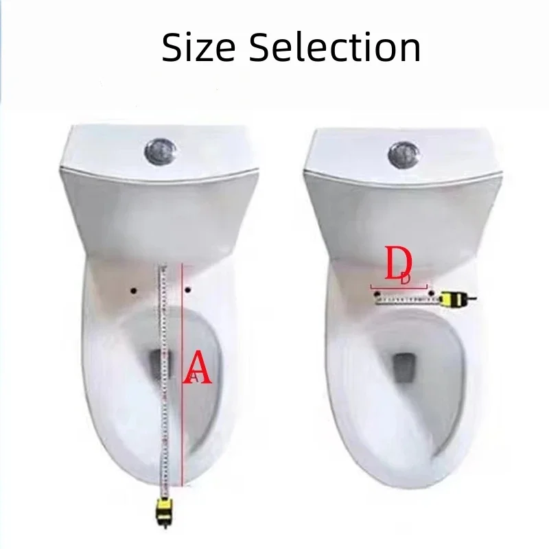 1.Mesure les dimensions de distance d’A et D comme indiqué dans la figure.Si la taille D est entre 12 cm-20 cm, vous pouvez repos assuré de commander notre couvercle de toilette