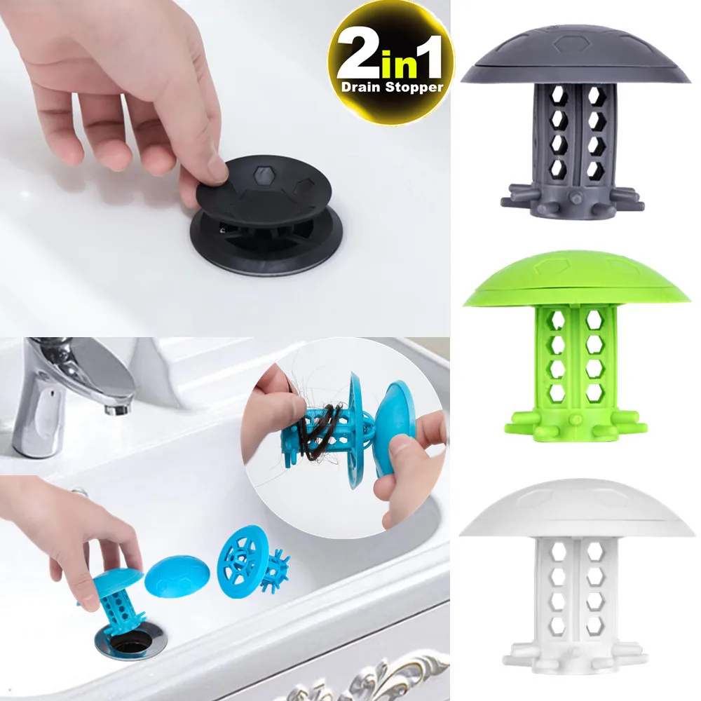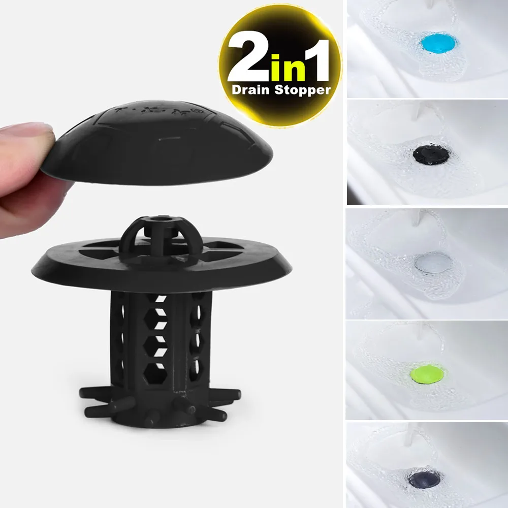 2, bouchon et crépine de baignoire 2 en 1, maintient l’eau dans l’évier ou évacue l’eau/attrape les cheveux et les objets obstruants. Il empêche également les odeurs et les puces des égouts.