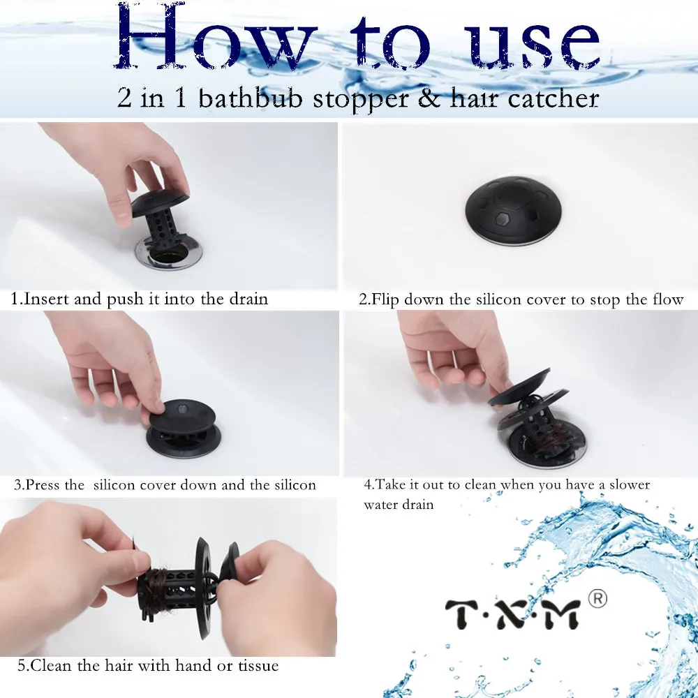 3,T · X · M 2 en 1 Design breveté: appuyez sur le couvercle en silicone vers le bas et le couvercle en silicone s’ouvre vers le haut, c’est un attrape-cheveux. Rabattez le couvercle en silicone, il s’agit d’un bouchon de baignoire, plus besoin de basculer entre le bouchon de vidange et l’attrape-cheveux de vidange. Profitez simplement de votre bain.