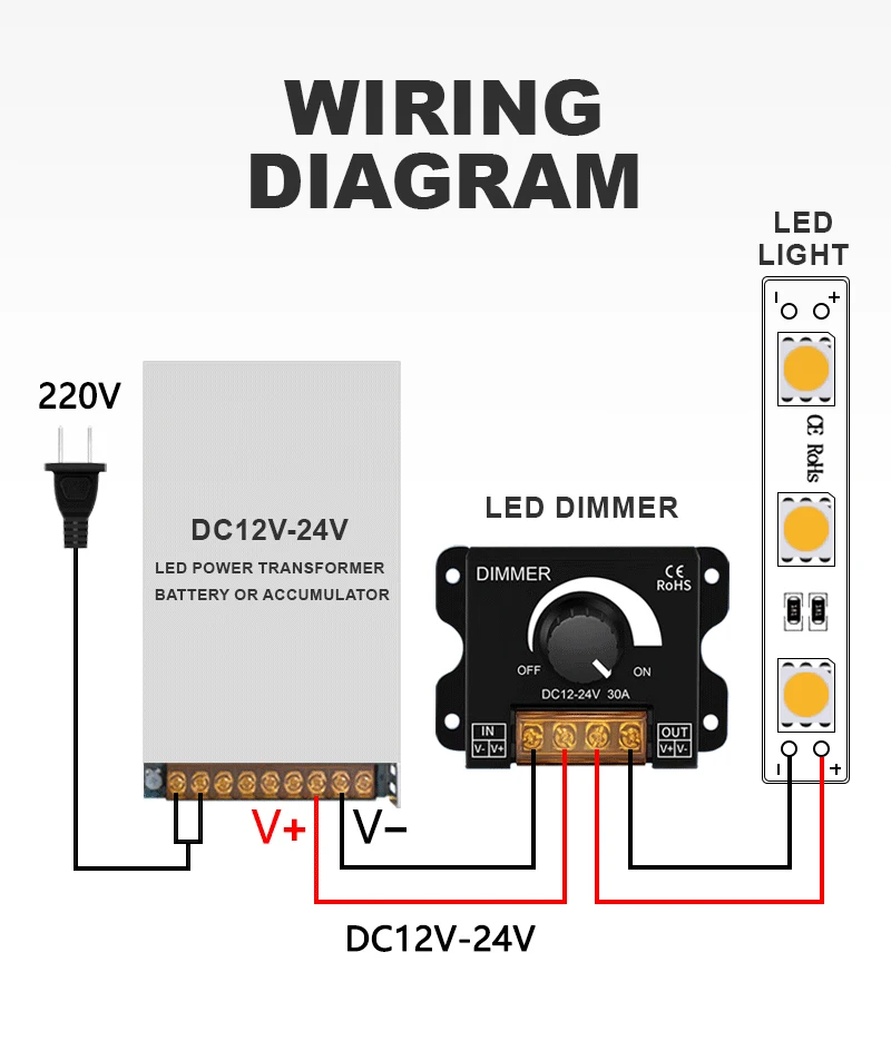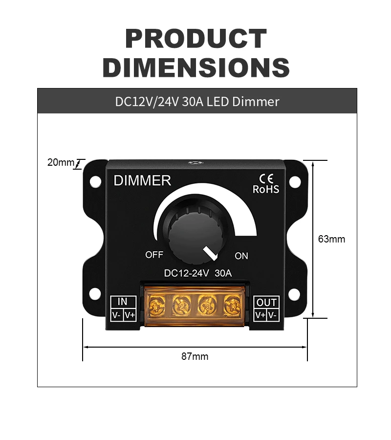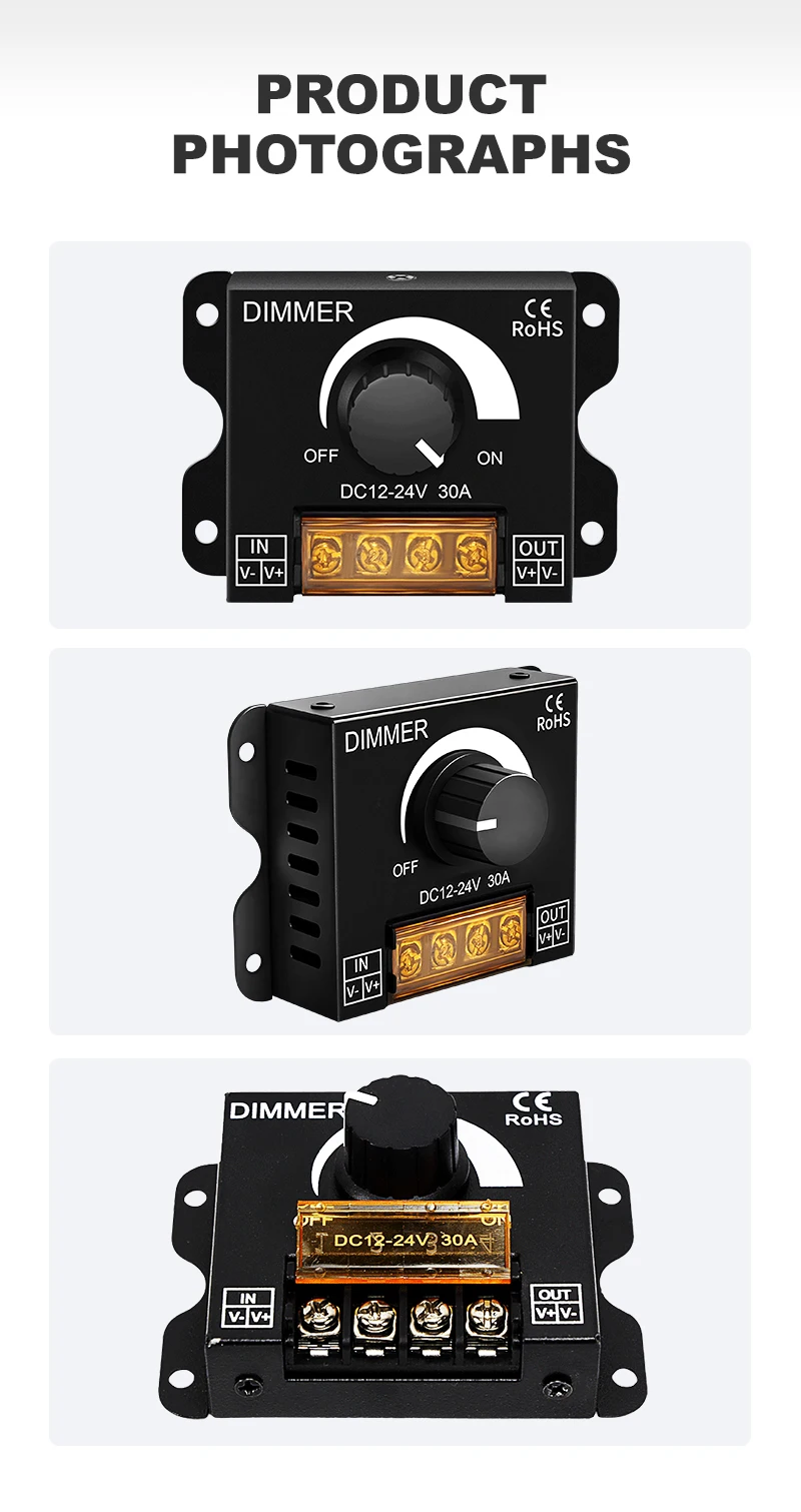 Principalement utilisé pour ajuster les luminaires/bandeaux lumineux LED monochromes. Bandes lumineuses monochromes 5050 3528. Ne convient pas aux luminaires LED mixtes multicolores (tels que les bandes lumineuses/lampes RVB, les lampes de bureau, les ventilateurs, les lampes à économie d’énergie, les ampoules, etc.)