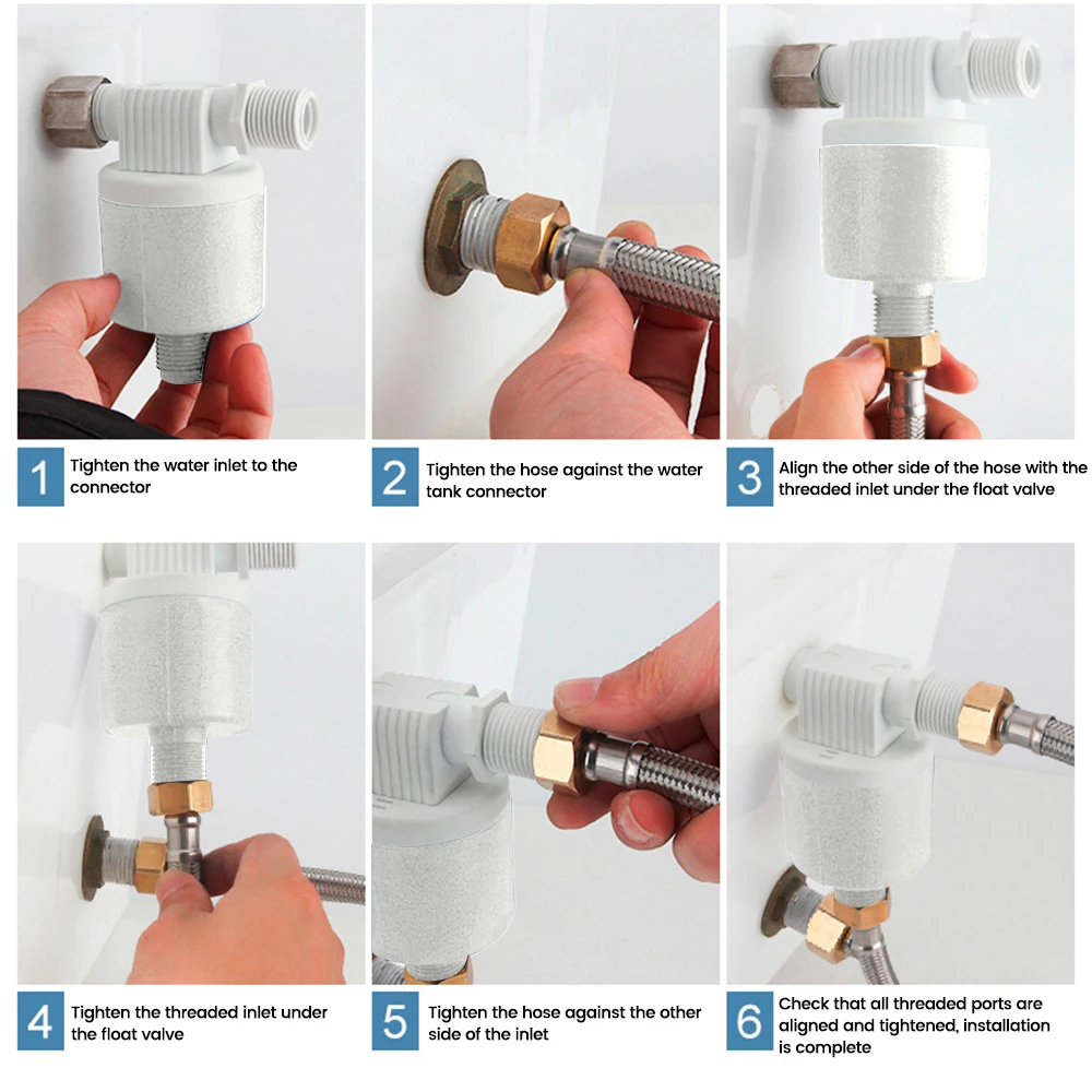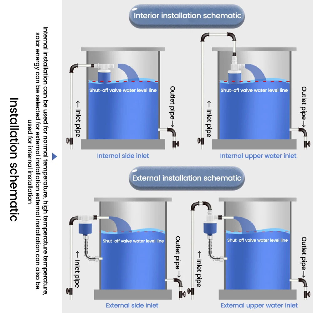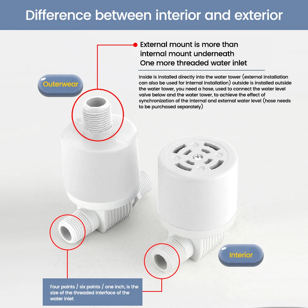 L’installation externe a une entrée d’eau plus filetée que l’installation interne.L’installation interne est directement installée dans la tour d’entrée d’eau (installation externe peut également être utilisée pour l’installation interne).L’installation externe est installée à l’extérieur de la tour d’eau et nécessite un tuyau pour connecter la vanne de niveau d’eau inférieure et à la tour d’eau, achetez l’effet des niveaux d’eau interne et externe synchronisés (le tuyau doit être acheté séparément)