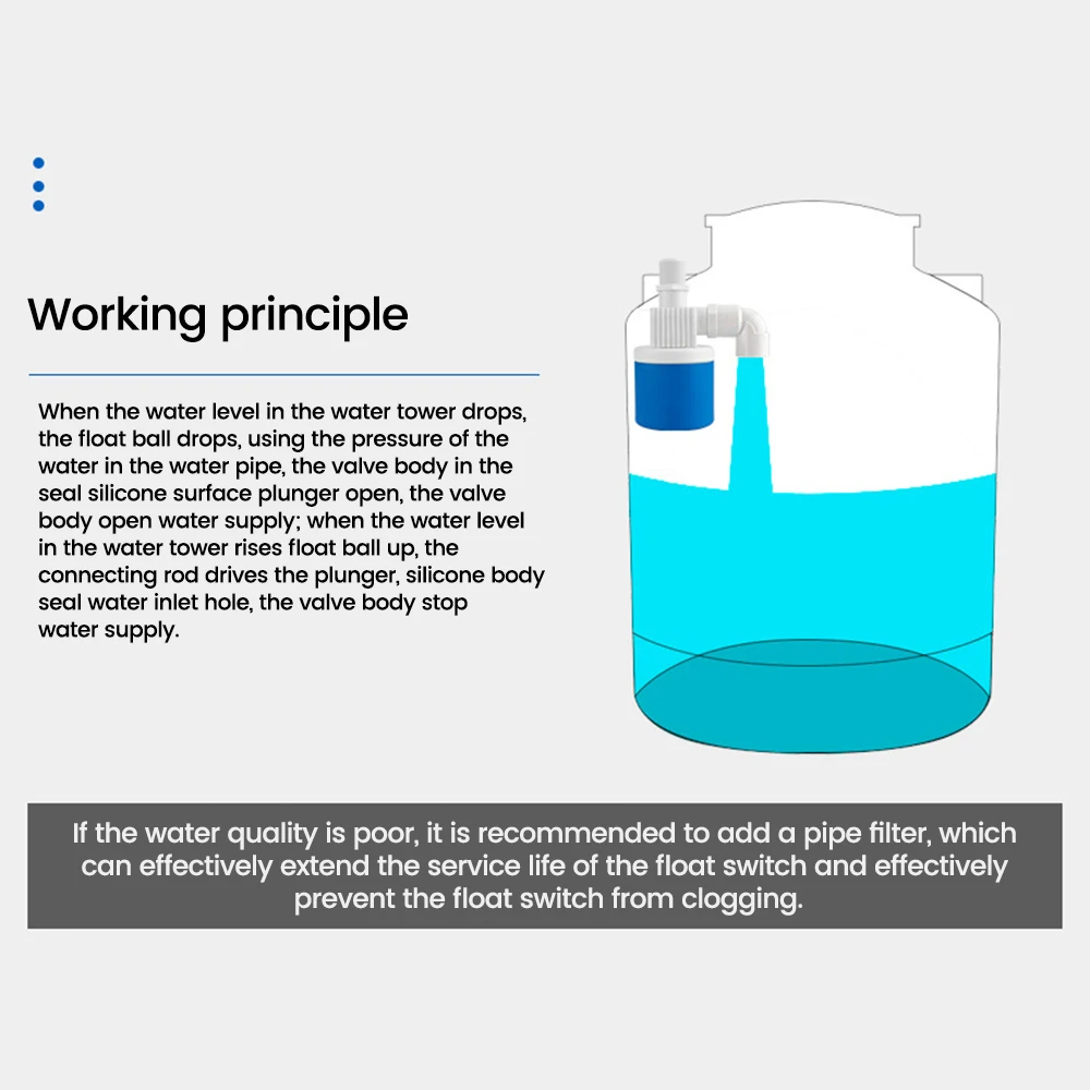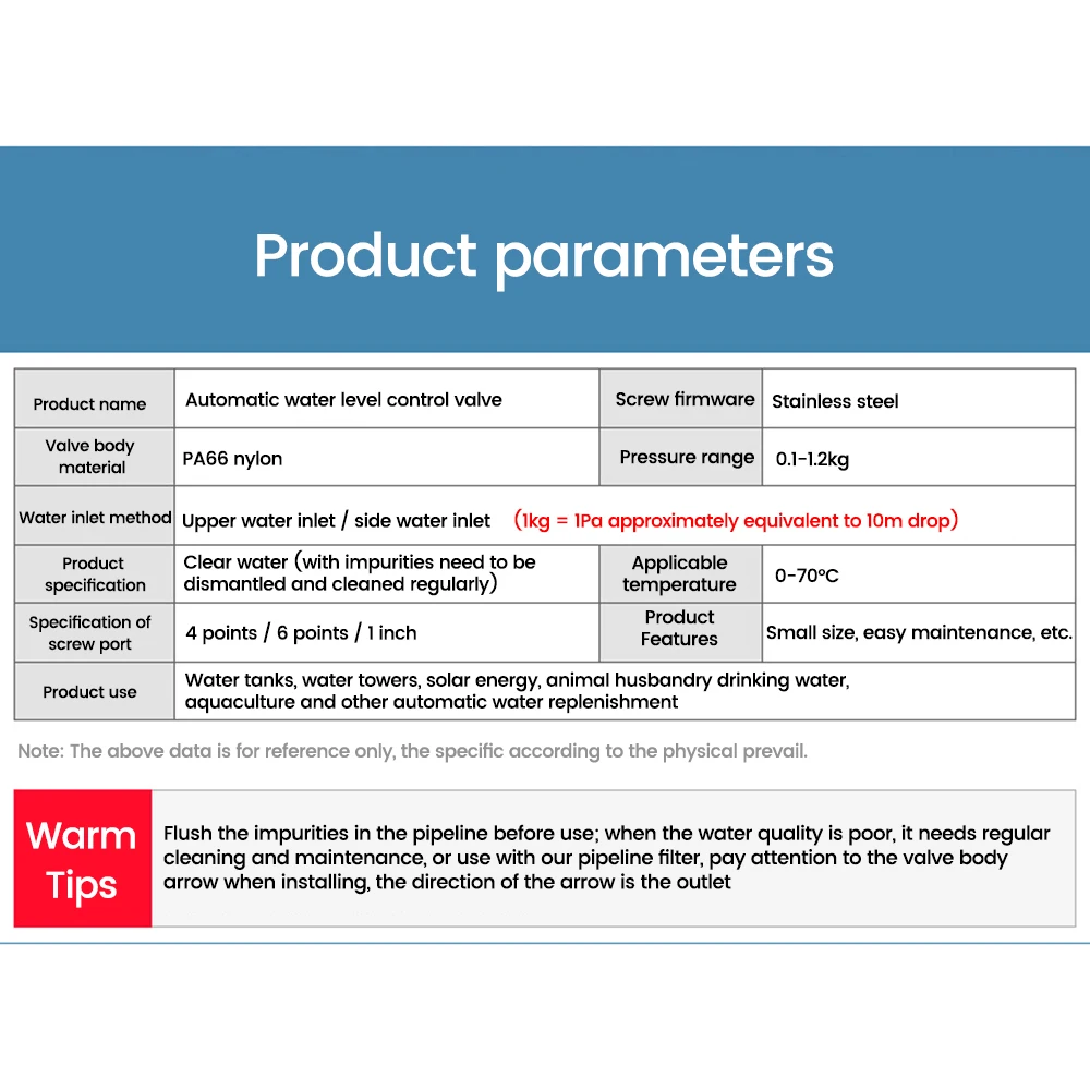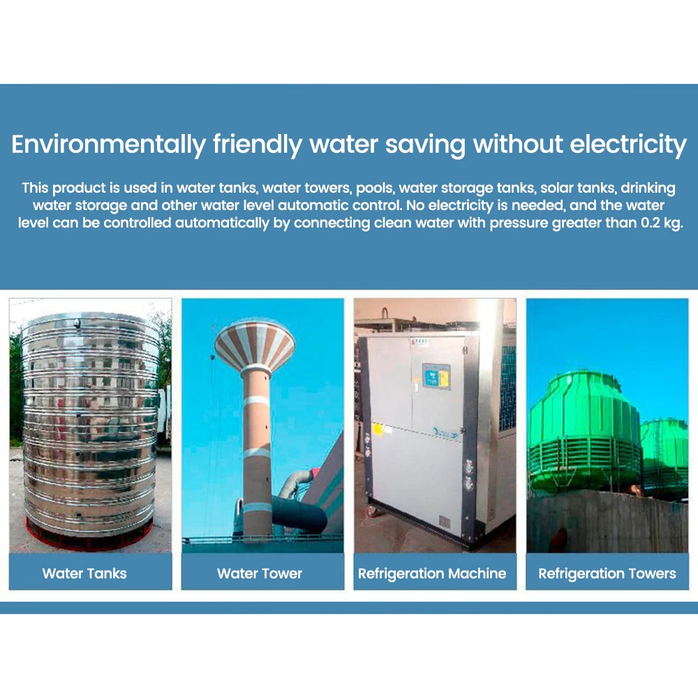 Ce produit est utilisé pour le contrôle automatique du niveau d’eau des réservoirs d’eau, des tours d’eau, des piscines, des réservoirs de stockage, des réservoirs d’eau à énergie solaire, du stockage d’eau potable, ainsi de suite.Aucune électricité est requise et le contrôle automatique du niveau d’eau peut être achievé par connecter l’eau propre avec une pression supérieure à 0,2 kilogrammes.