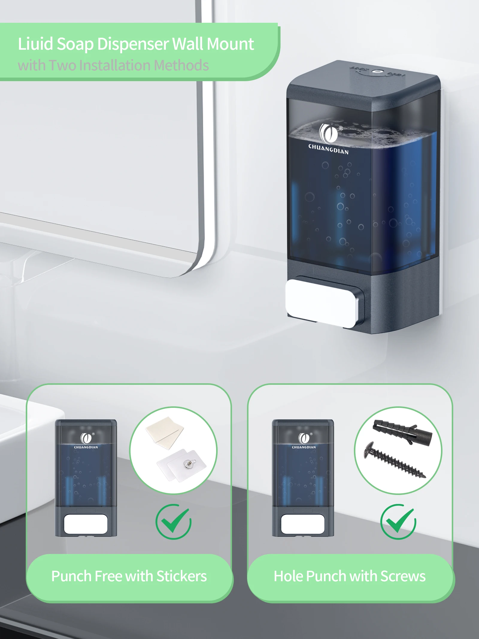 le distributeur de savon de salle de bain au mur avec des vis ou collez-le au mur avec des autocollants.
