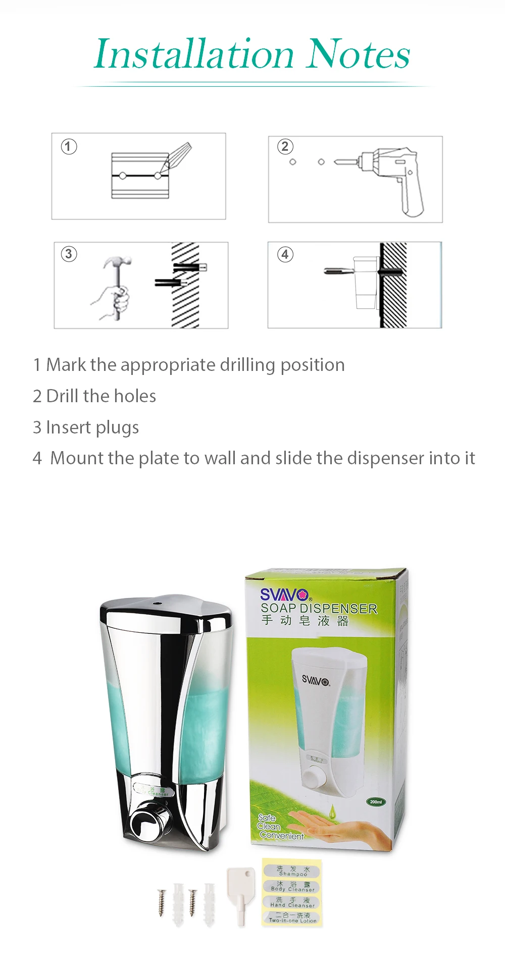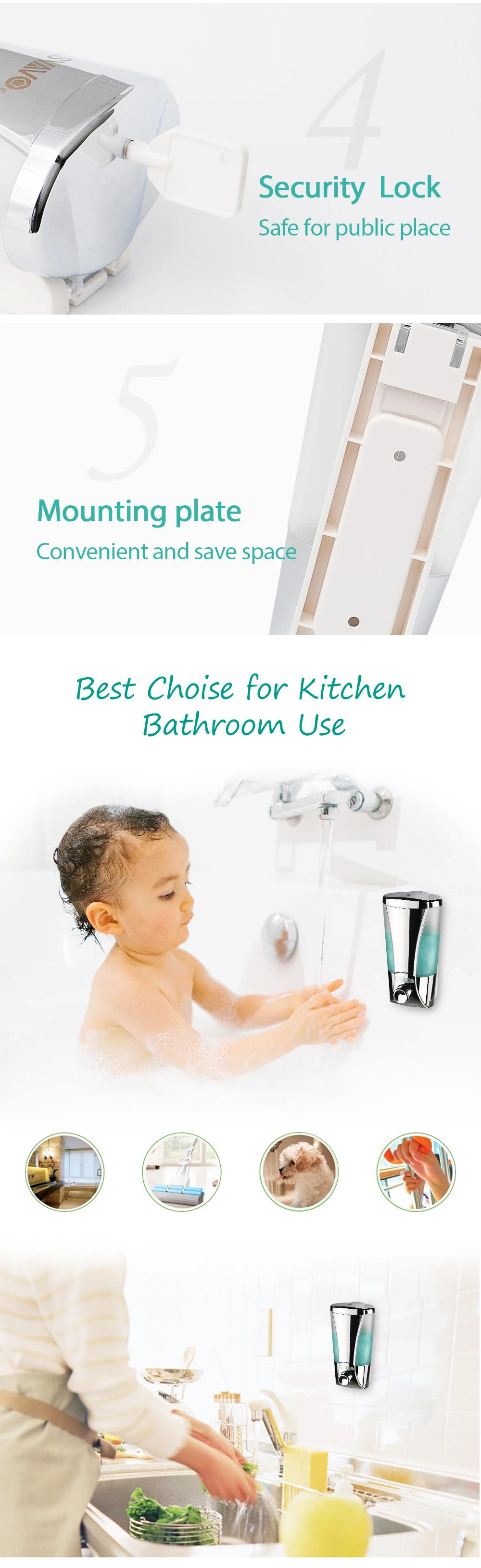 Distributeur de savon liquide mural à pression manuelle de 200ml, avec serrure de sécurité, distributeur de savon manuel chromé blanc pour cuisine et salle de bains