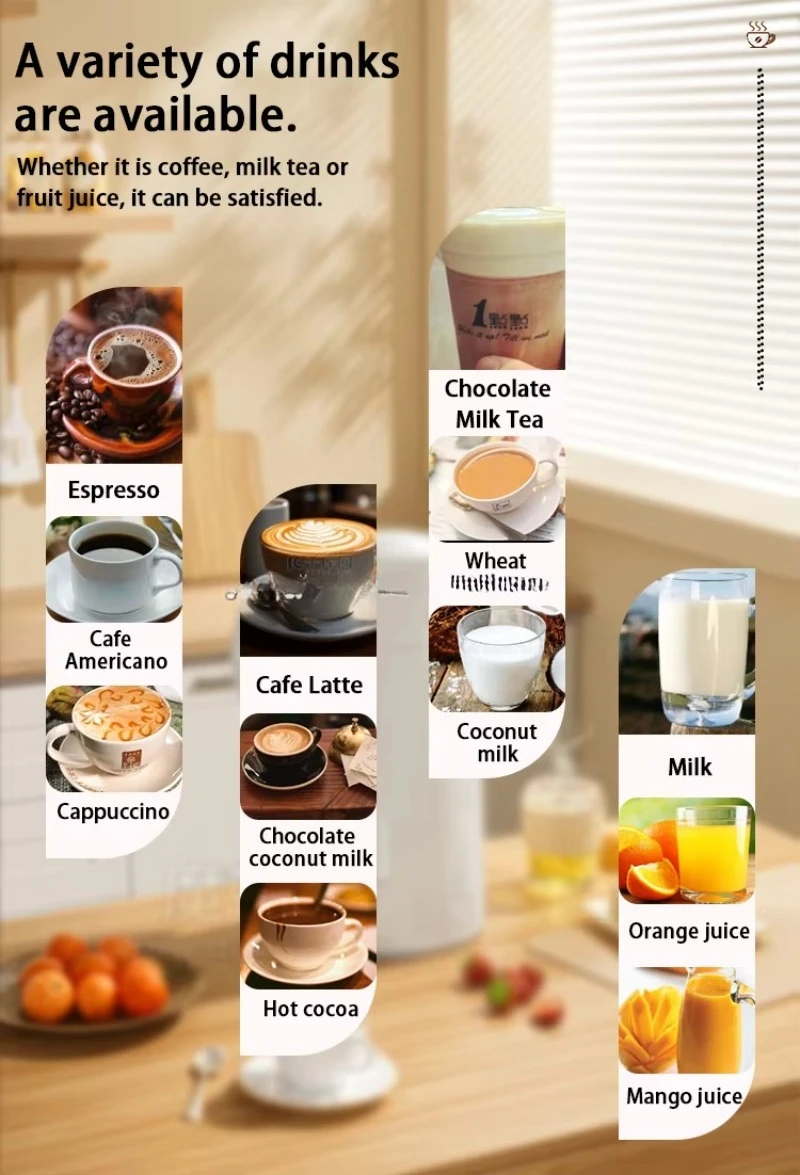 Maximum 32 saveurs disponibles, comprenant du café fraîchement moulu, des boissons instantanées et des jus concentrés.Les saveurs sont déterminées par matière première (e.g., grains de café, poudres, sirops).