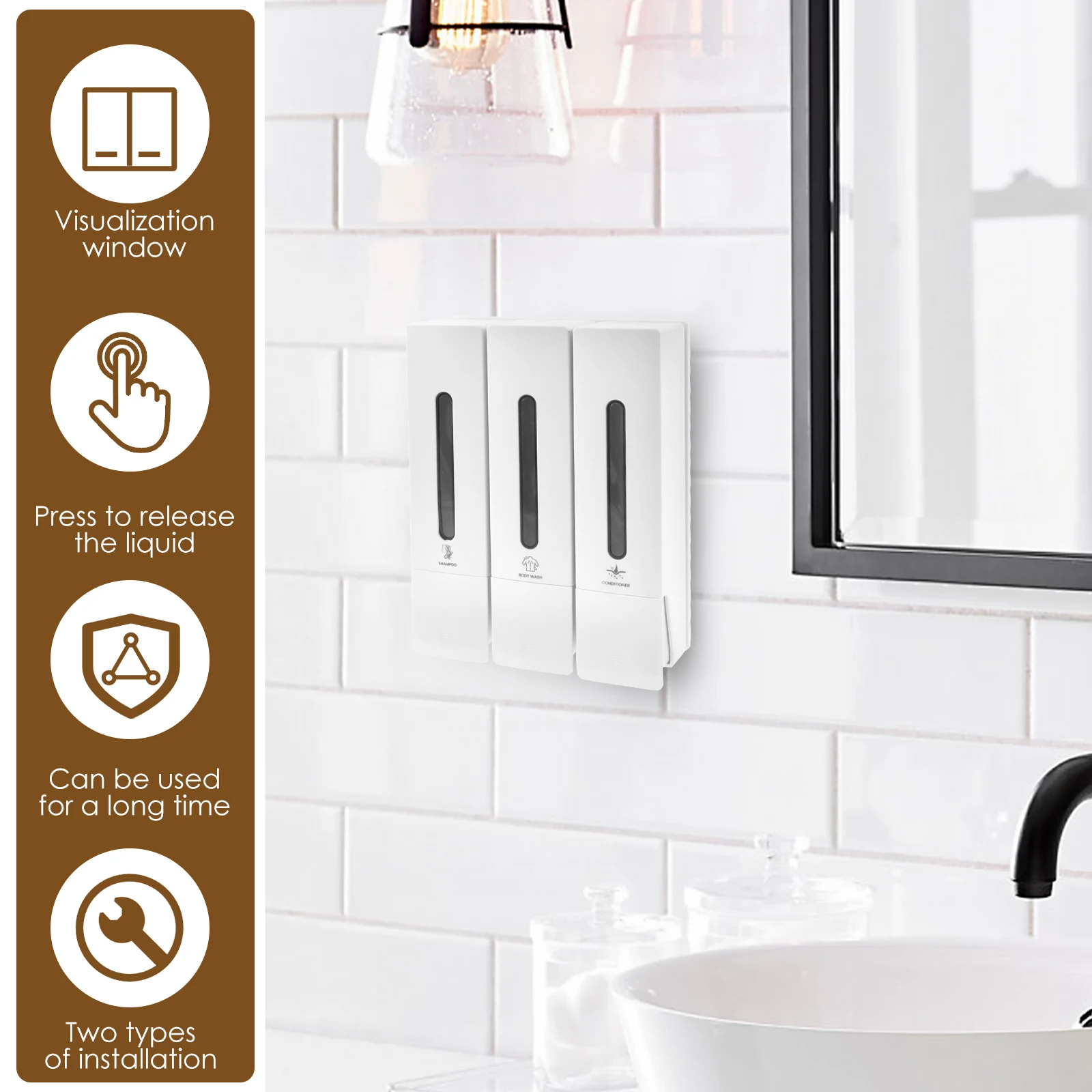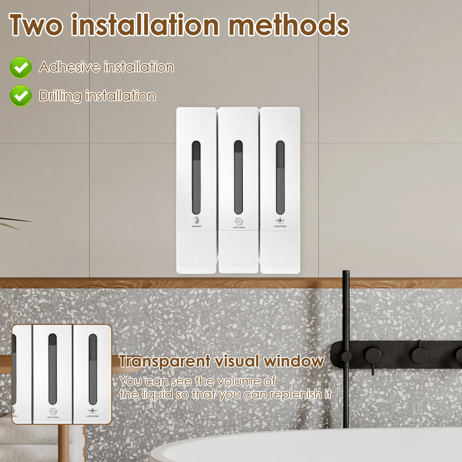 3) Facile à installer: ce distributeur de conditionneur a 2 façons d’installer. Vous pouvez utiliser l’adhésif inclus pour l’installer sans endommager le mur, ou vous pouvez utiliser des vis pour l’installation de perforation pour le fixer de manière stable sur le mur