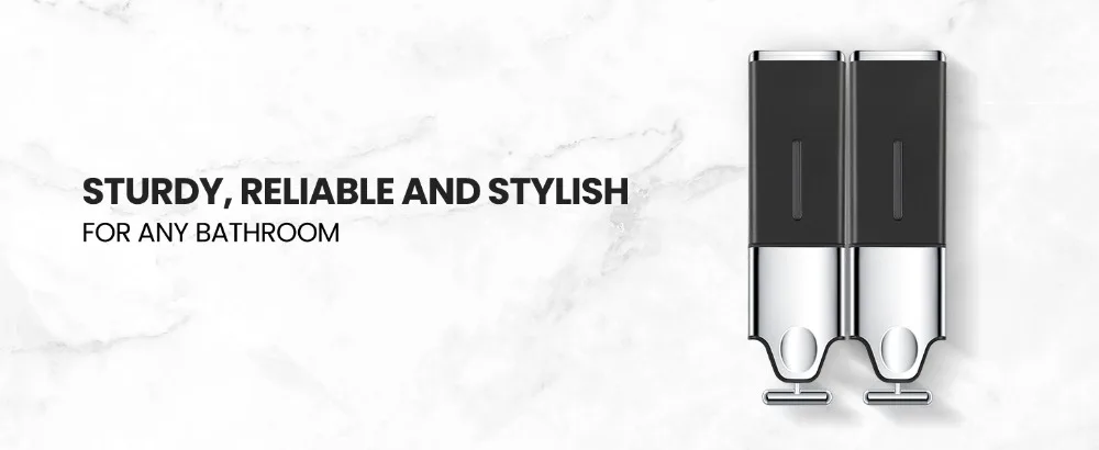 distributeur mural double savon shampooing revitalisant liquide ABS chromé rectangulaire compact transparent fenêtre verticale levier poussoir ergonomique anti goutte