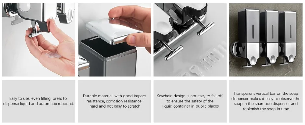 【FASY TO UES】 Ce distributeur de savon de douche est conçu avec une fenêtre transparente transparente, vous connaissez clairement l’importo et réapprouvez le liquide dans le temps, permettant l’utilisateur pour vérifier facilement la capacité. Le design de grande capacité vous n’avez plus besoin d’ajout de liquide fréquemment, la grande bouche de bouteille sur le distributeur de savon est pratique pour vous ajouter du liquide à tout moment.