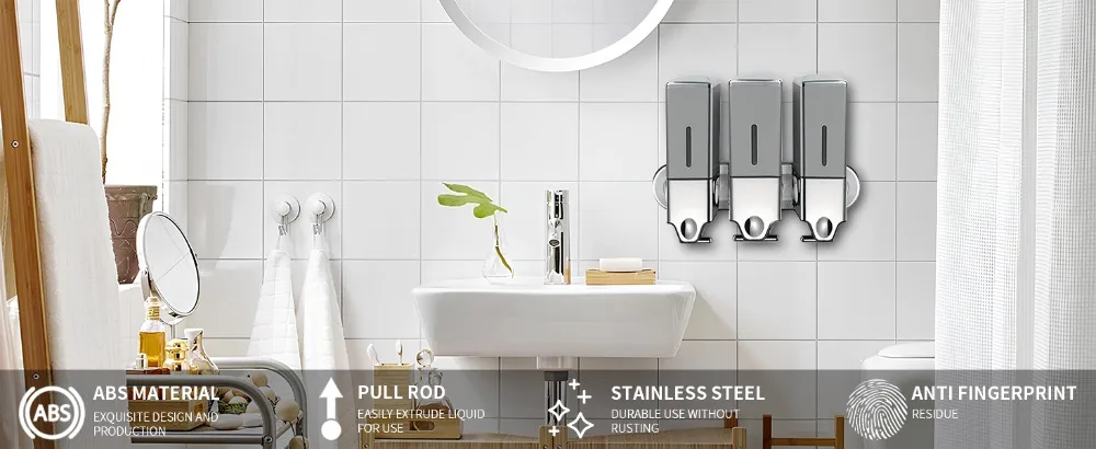 【 MATÉRIAUX D’ÉTÉ】 Le logement de ce distributeur de salle de bain est composé de plastique ABS durable et étanche. Ne rouille pas ou décolorer. La barre de traction en forme de T vous aide à prendre le shampooing plus pratique, rendez facile à distribuer, spécial pour les produits liquides, comme désinfectant pour les mains, nettoyant pour le visage, savon, crème de bain pour le visage, shampoing pour hommes, etc.
