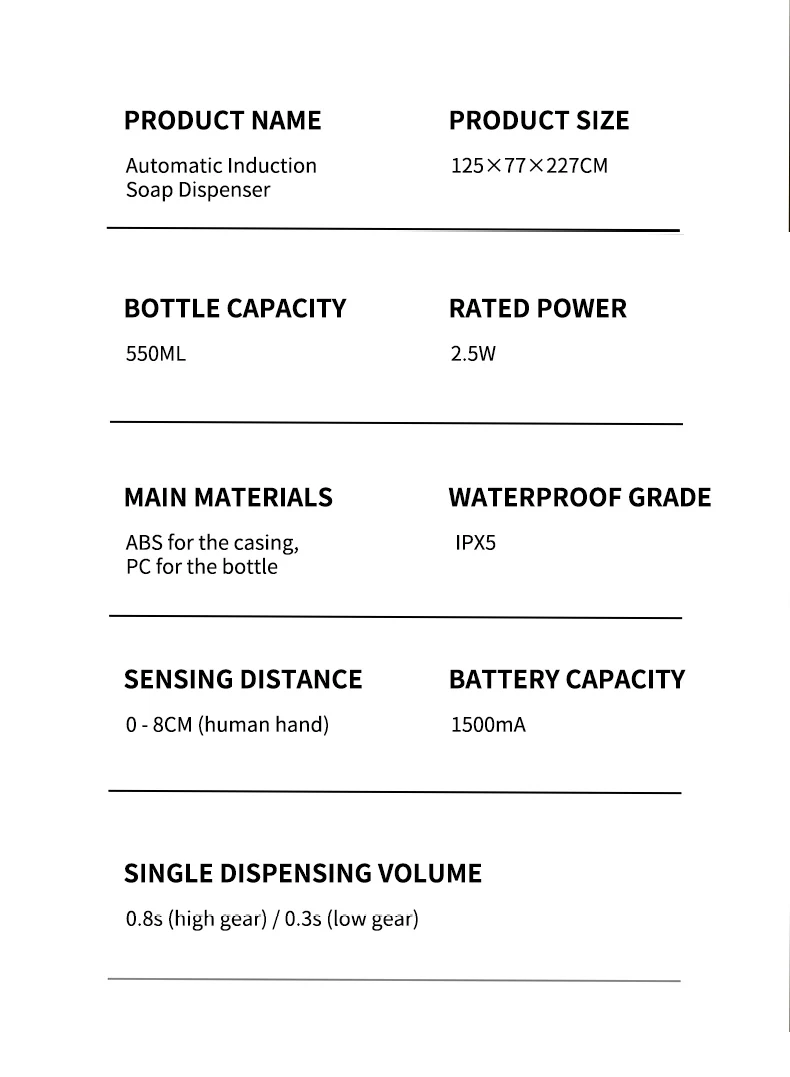 Contrôle du niveau du savon : 2 niveaux de savon réglables pour répondre aux besoins différents du lavage des mains ou du lave-vaisselle.Le montant du savon liquide est ajusté automatiquement selon la hauteur des mains.