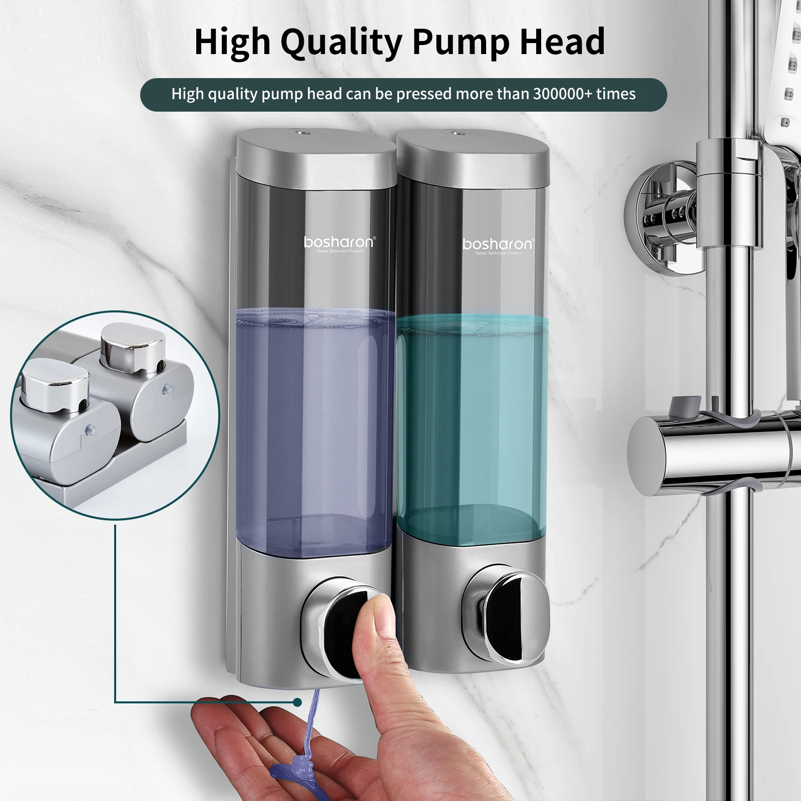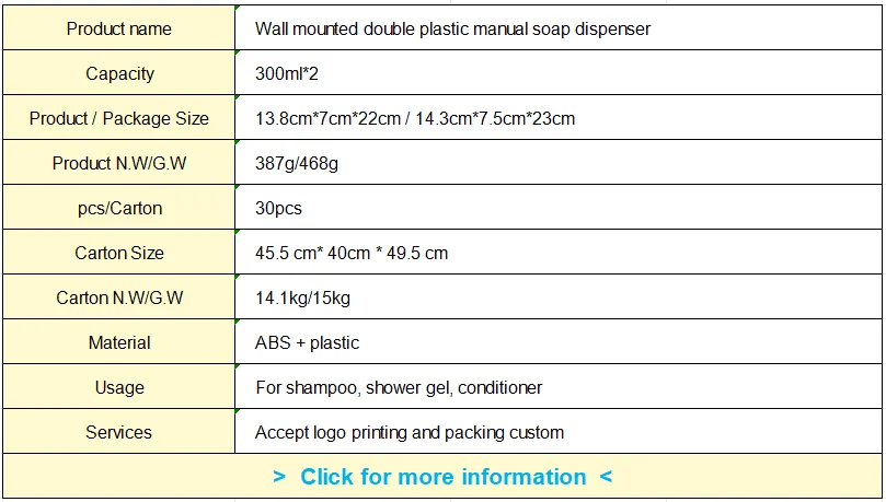 Soyez le premier à laisser votre avis sur “Double distributeur de savon liquide en plastique, 300 ml x 2 HOKitchen, mural, argenté, distributeur manuel de gel shampoing, usine”