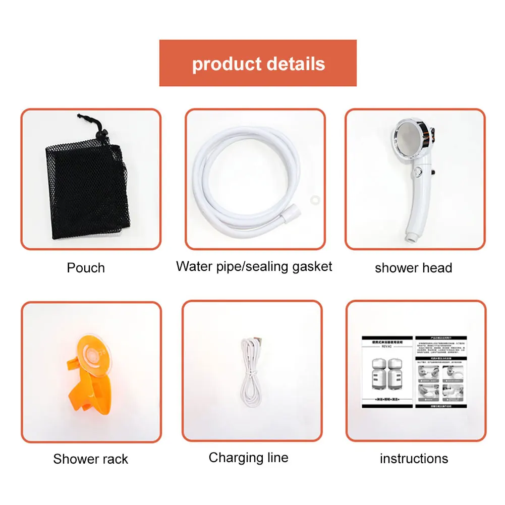 1 * tuyau d’eau 1 * pomme de douche 1 * câble de chargement 1 * support de douche 1 * sac de rangement 1 * manuel d’instructions