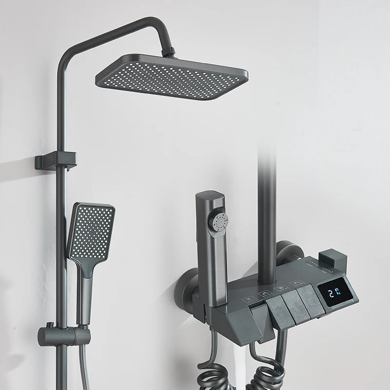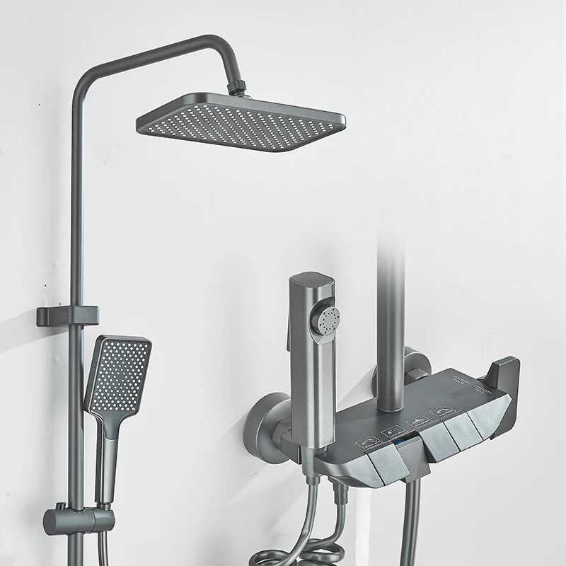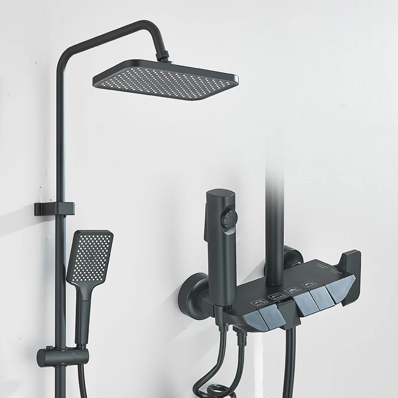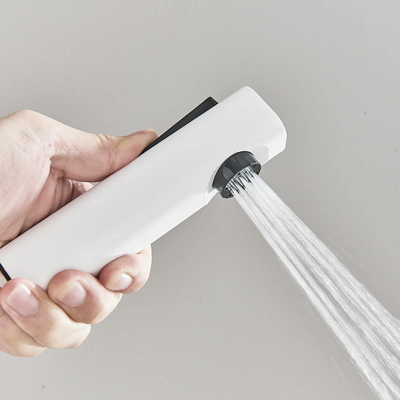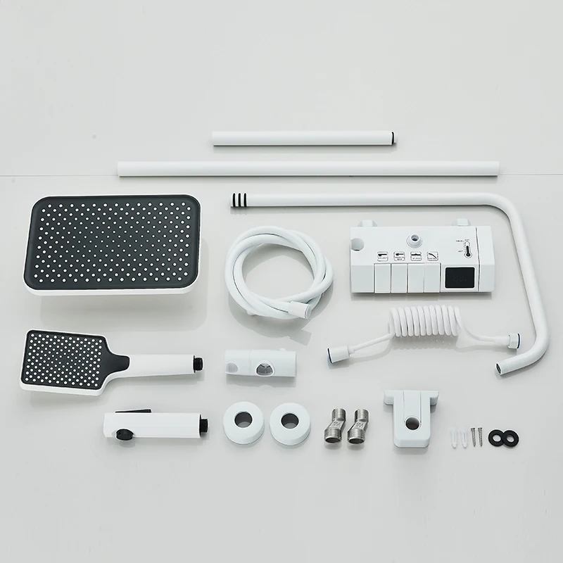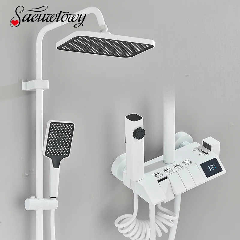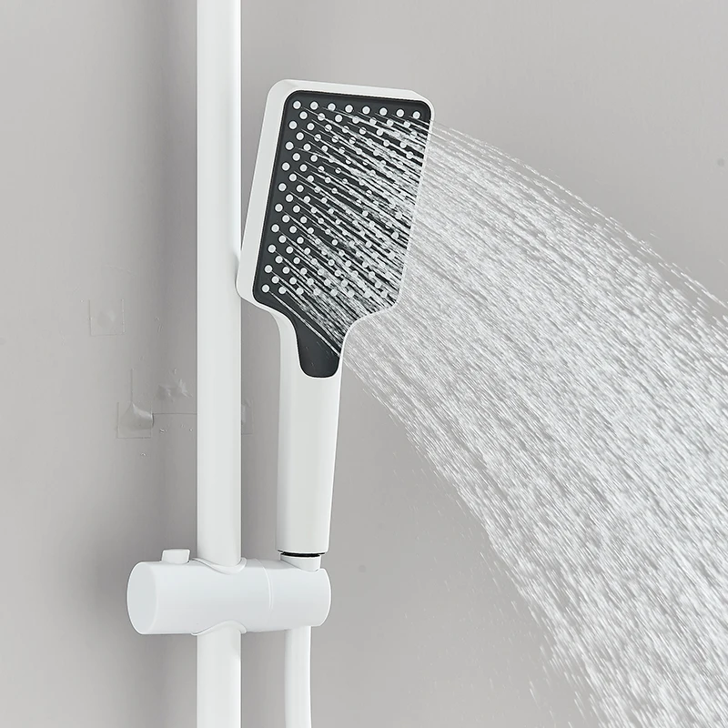 Robinet de douche de salle de bains blanc, mélangeur à boutons à 4 voies, pomme de douche à pluie, grue, douchette à main, bec de baignoire avec robinet de Bidet