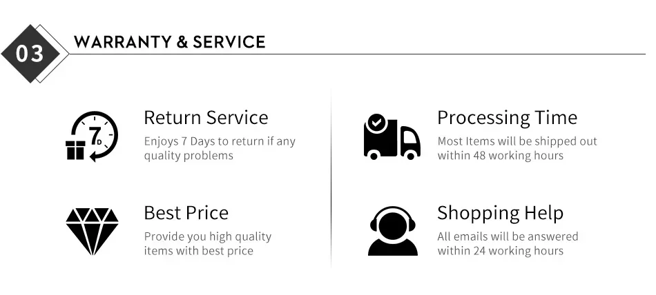 (2) Si vous rencontrez un problème avec nos articles ou services, veuillez nous contacter d’abord avant de nous laisser des commentaires négatifs. Nous résoudrons votre problème et vous fournirons les meilleurs services clients.