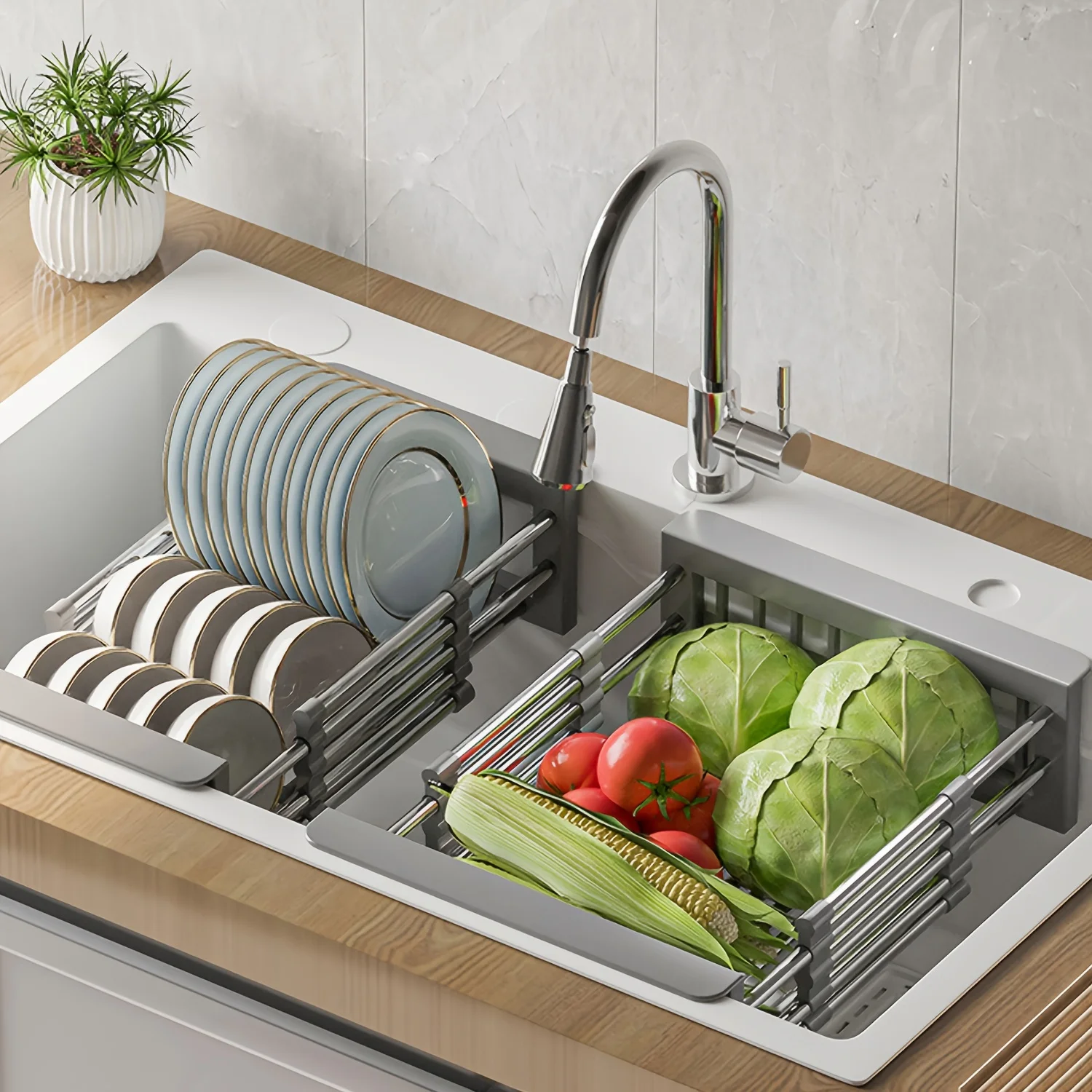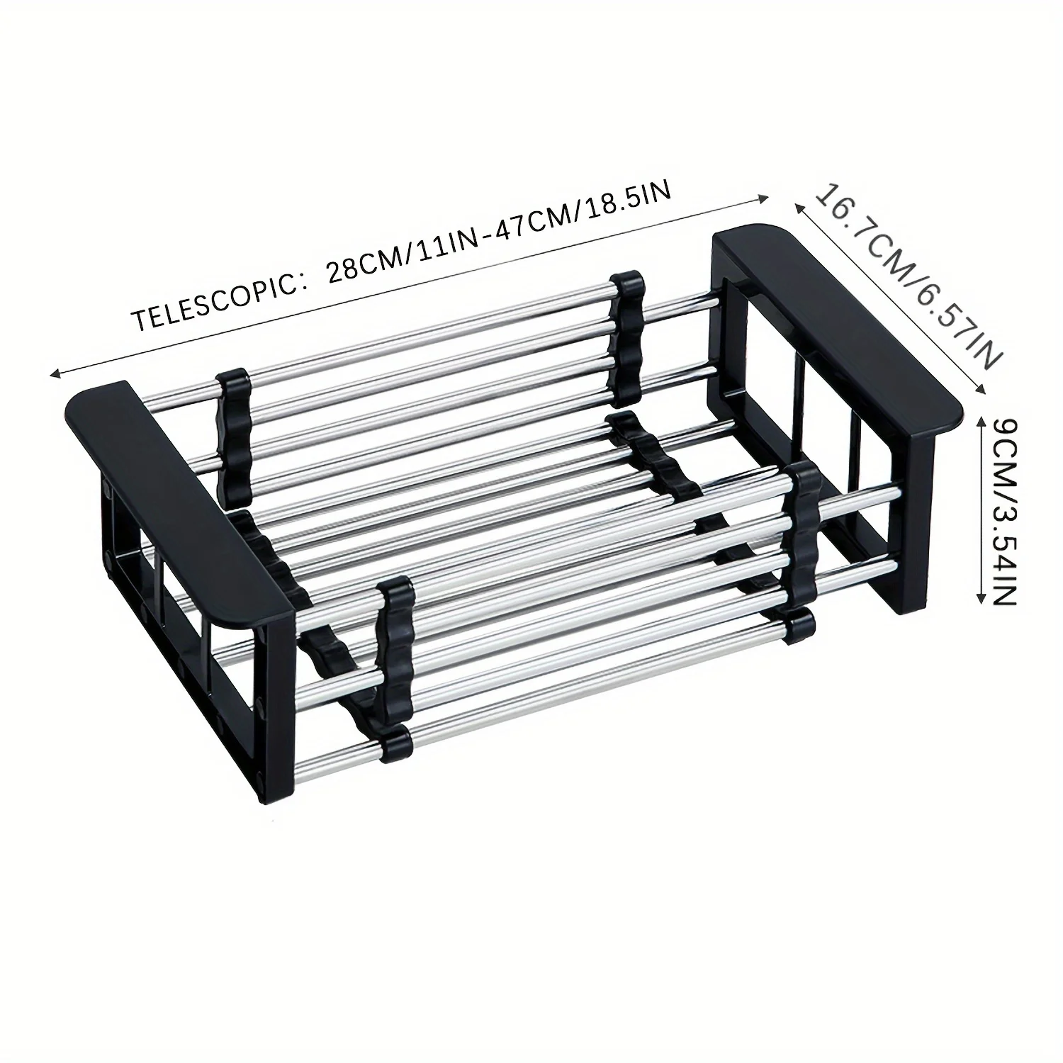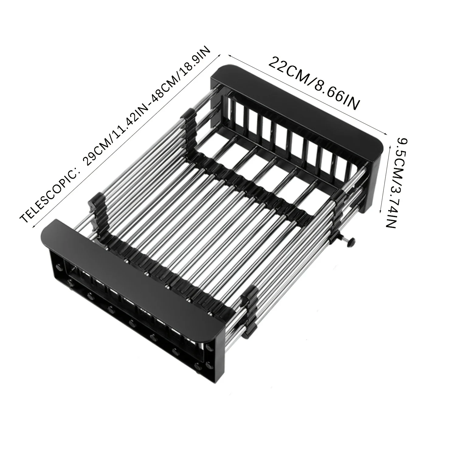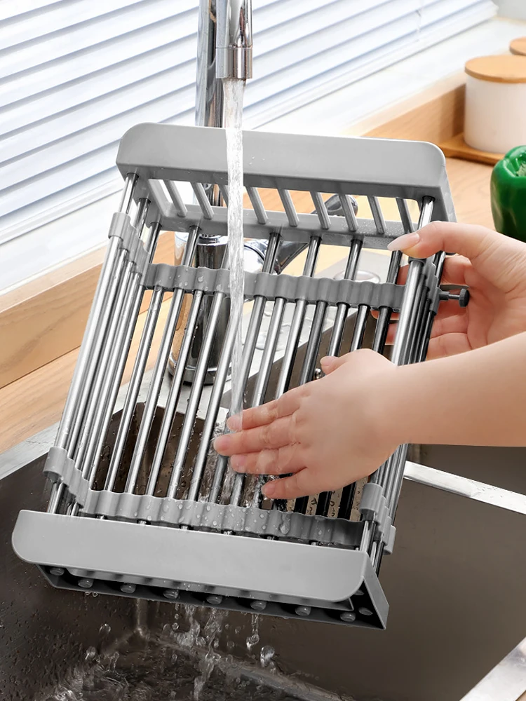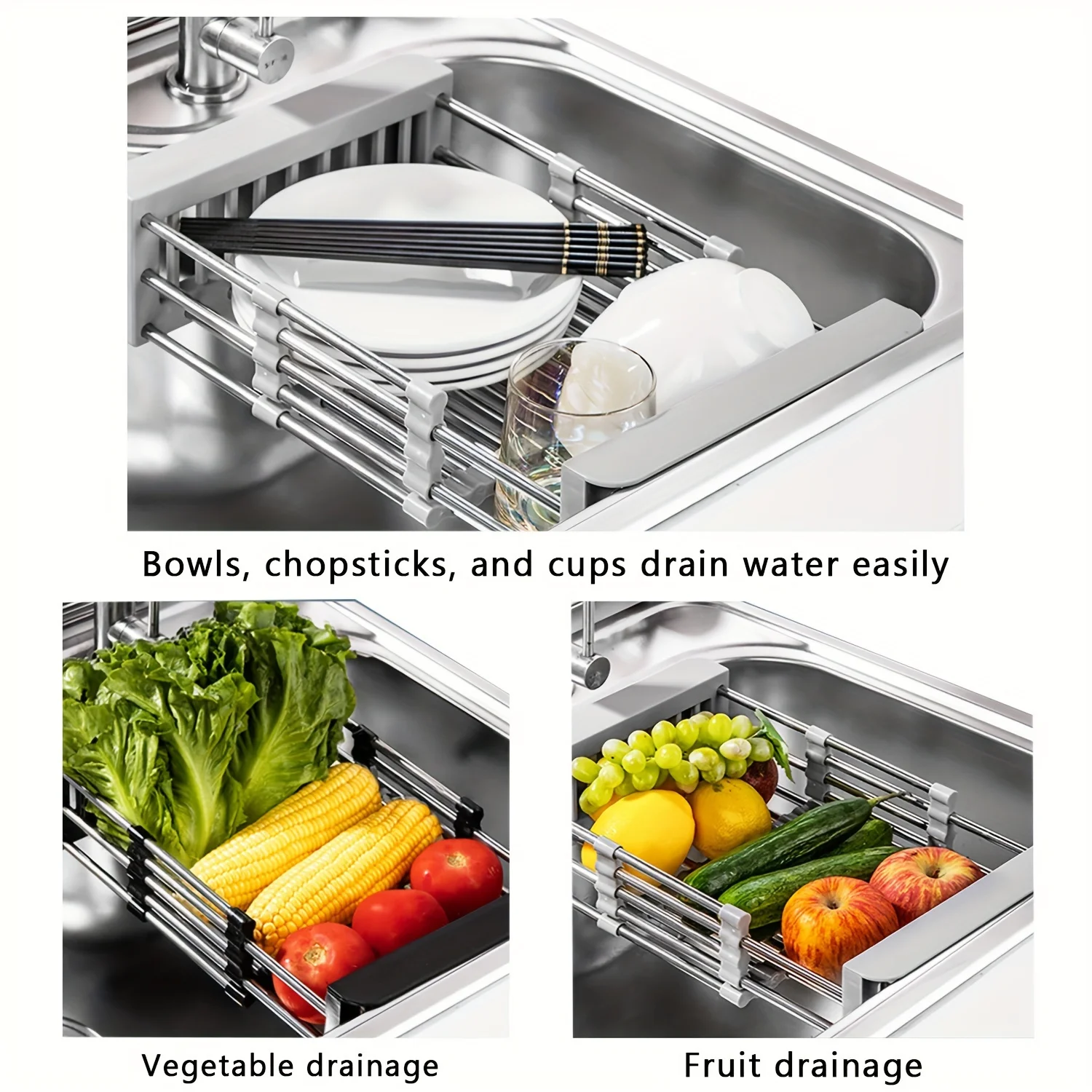 Égouttoir de cuisine extensible en acier inoxydable T1, cadre d’évier, rangement T1, stockage d’ustensiles de cuisine, bol et vaisselleÉgouttoir de cuisine extensible en acier inoxydable T1, cadre d’évier, rangement T1, stockage d’ustensiles de cuisine, bol et vaisselle