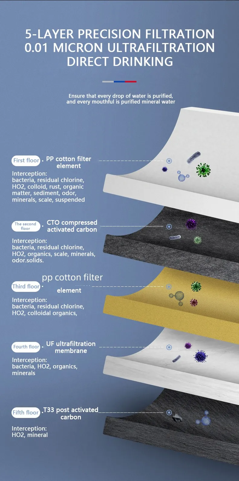 4.Boisson directe : taille du filtre jusqu’à 0,01 micro, plus sûr, taux d’élimination jusqu’à 99,95 % pour les sédiments, la rouille, les odeurs, la clor, etc.