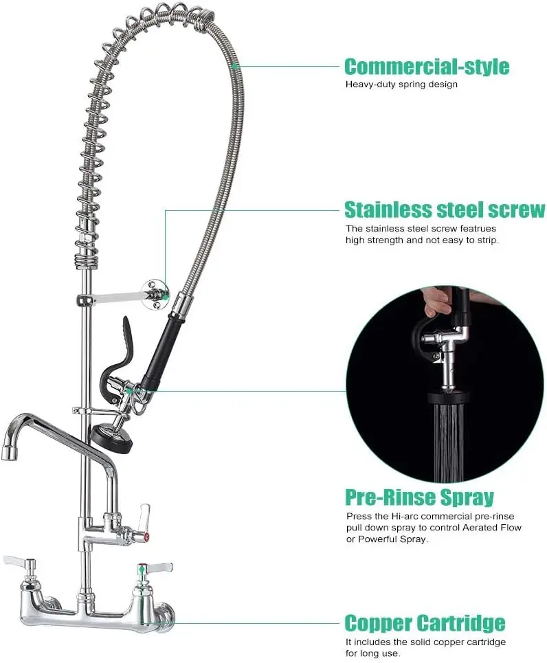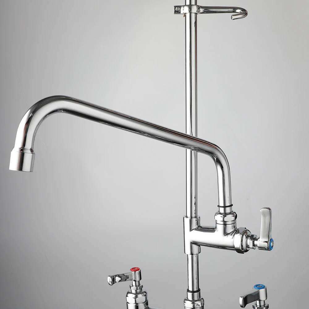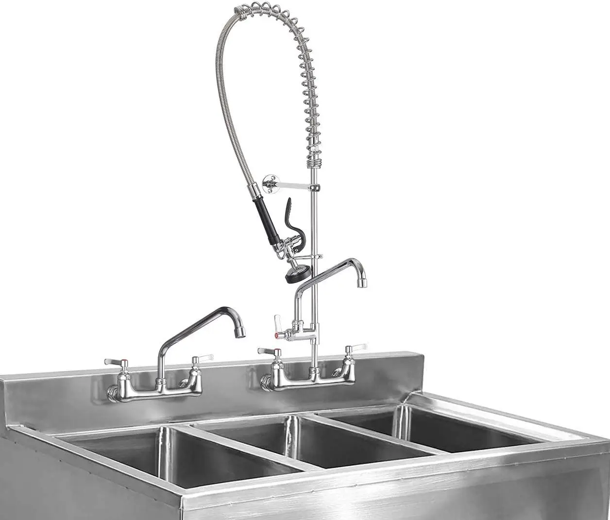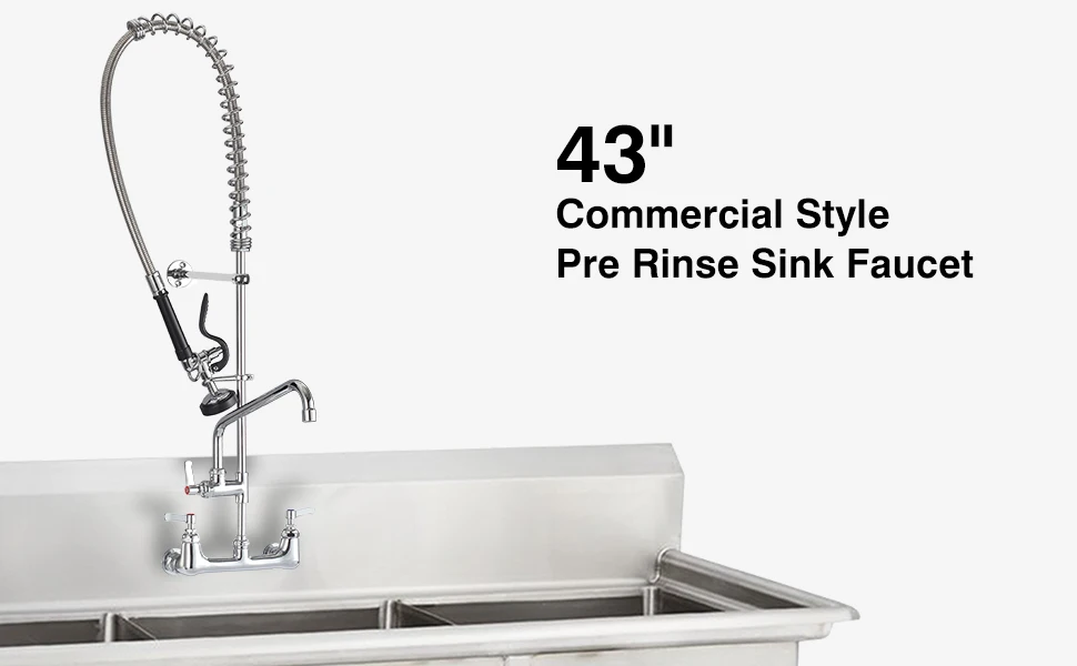 Hauteur totale 45 pouces de la bride de montage mural vers le haut. Le bec verseur de 12 pouces sur la partie du robinet peut atteindre 14.3 pouces du mur. Convient pour un évier de cuisine commercial de qualité professionnelle à 2 ou 3 compartiments.
