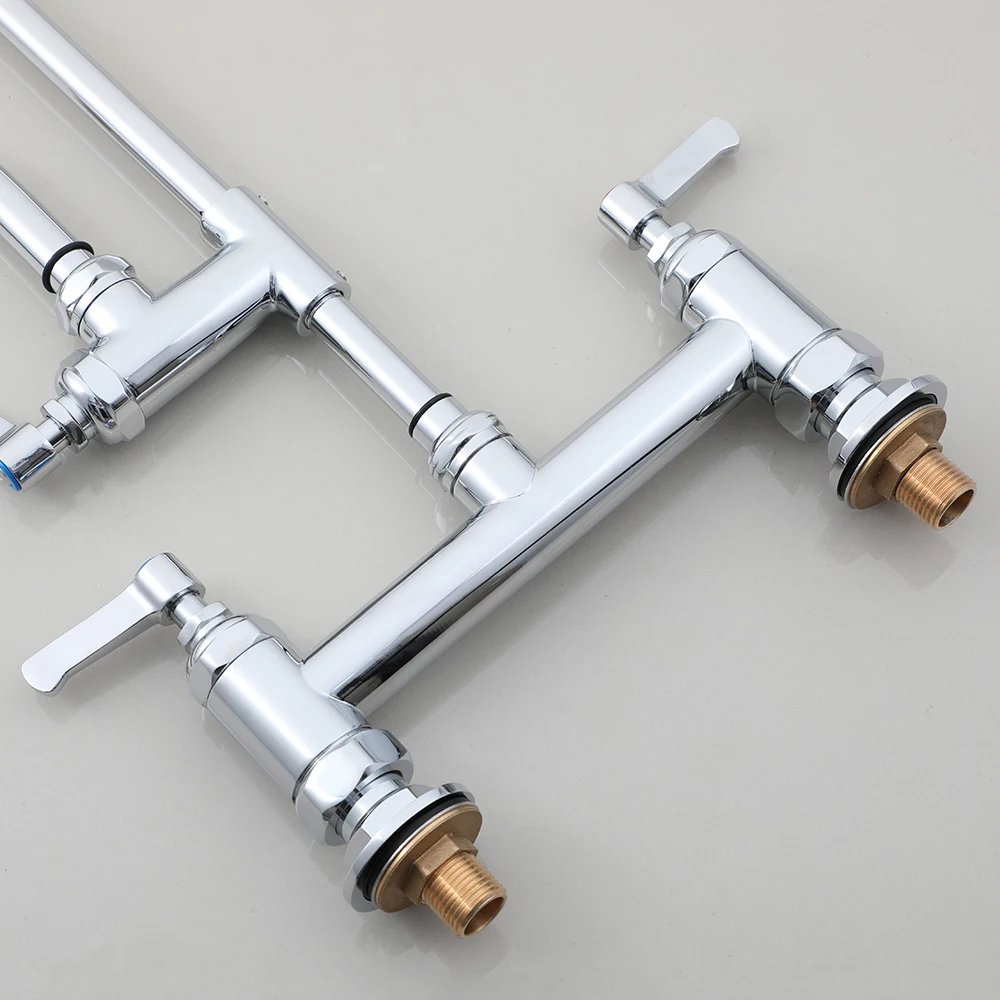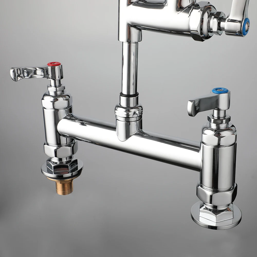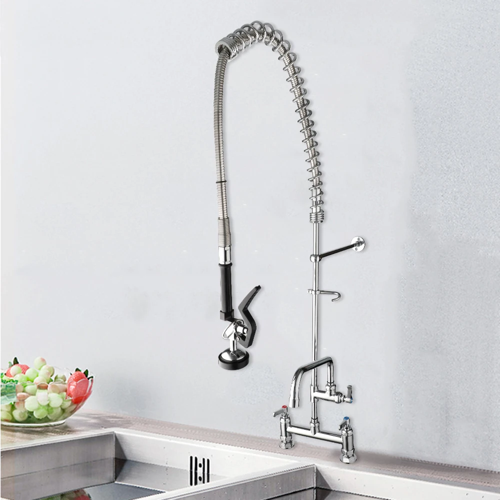 Hauteur totale 45 pouces de la bride de montage mural vers le haut. Le bec verseur de 12 pouces sur la partie du robinet peut atteindre 14.3 pouces du mur. Convient pour un évier de cuisine commercial de qualité professionnelle à 2 ou 3 compartiments.