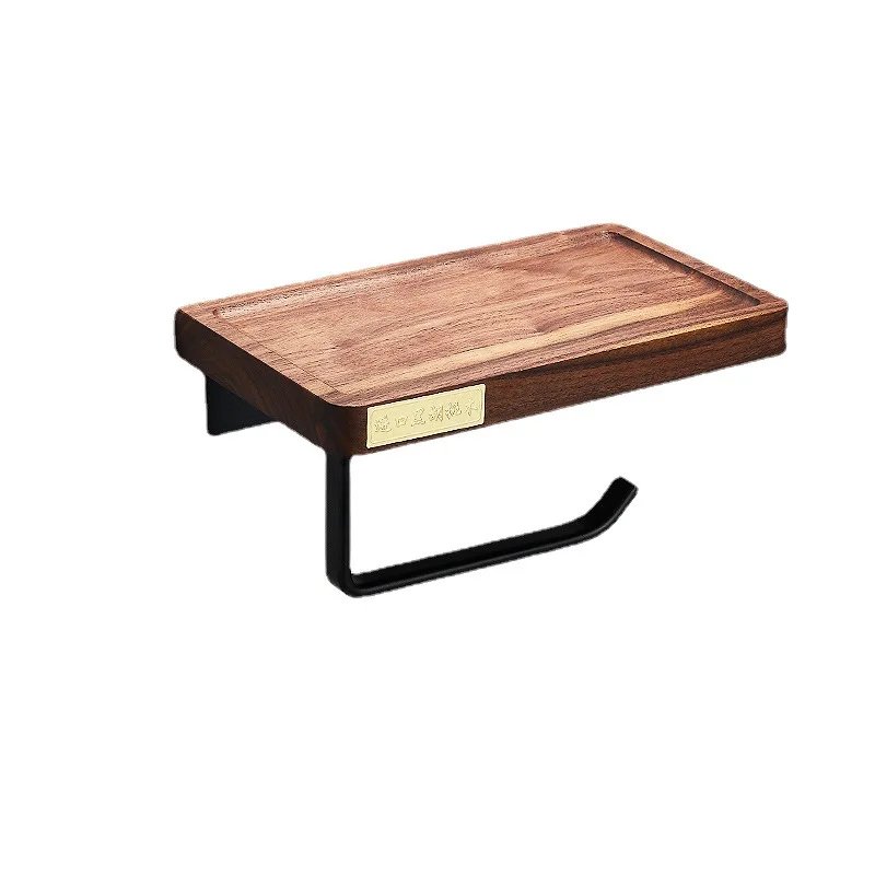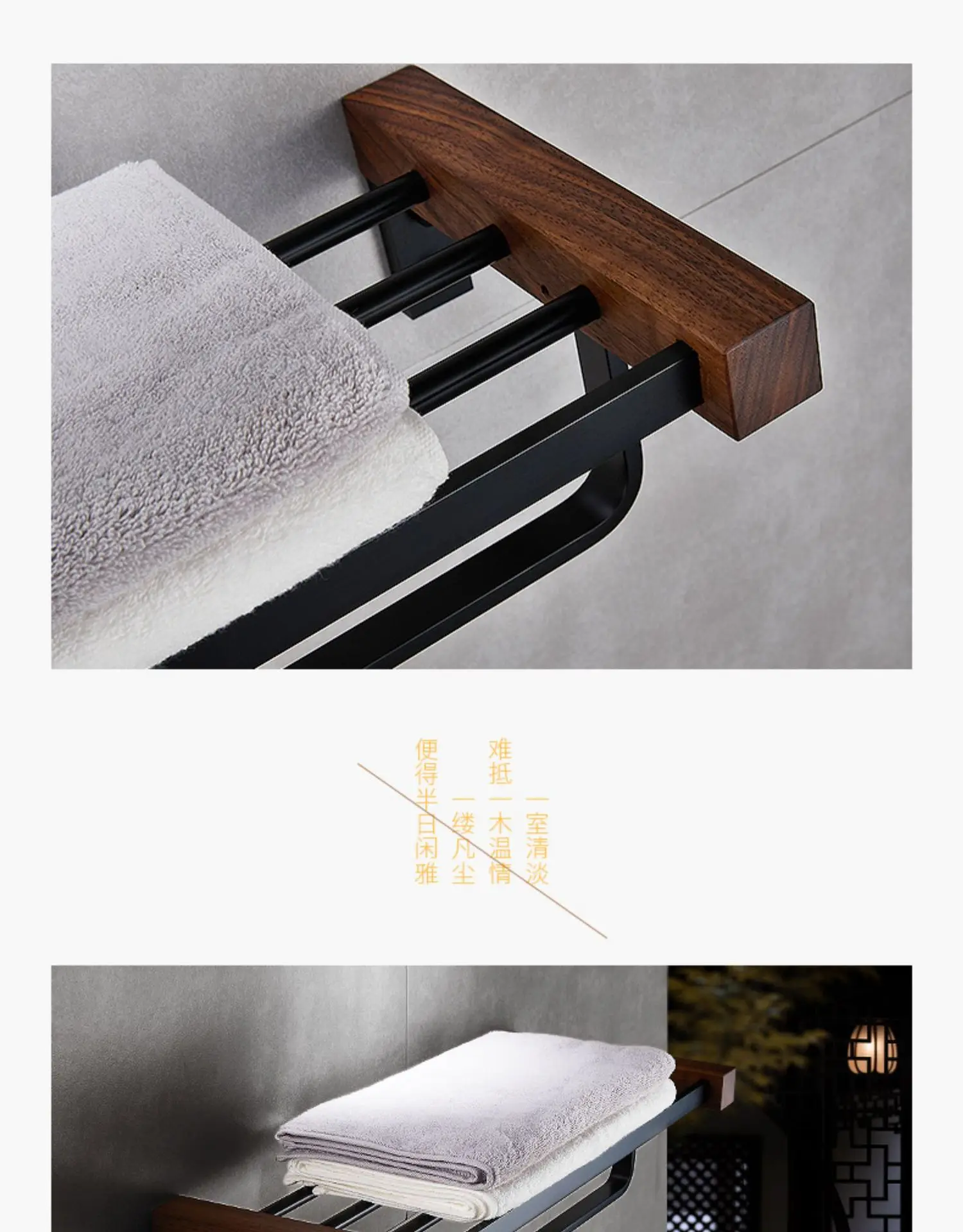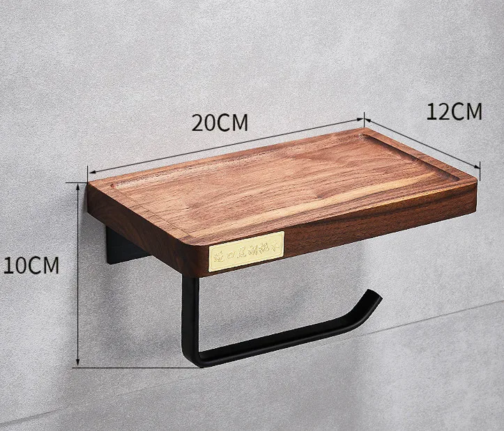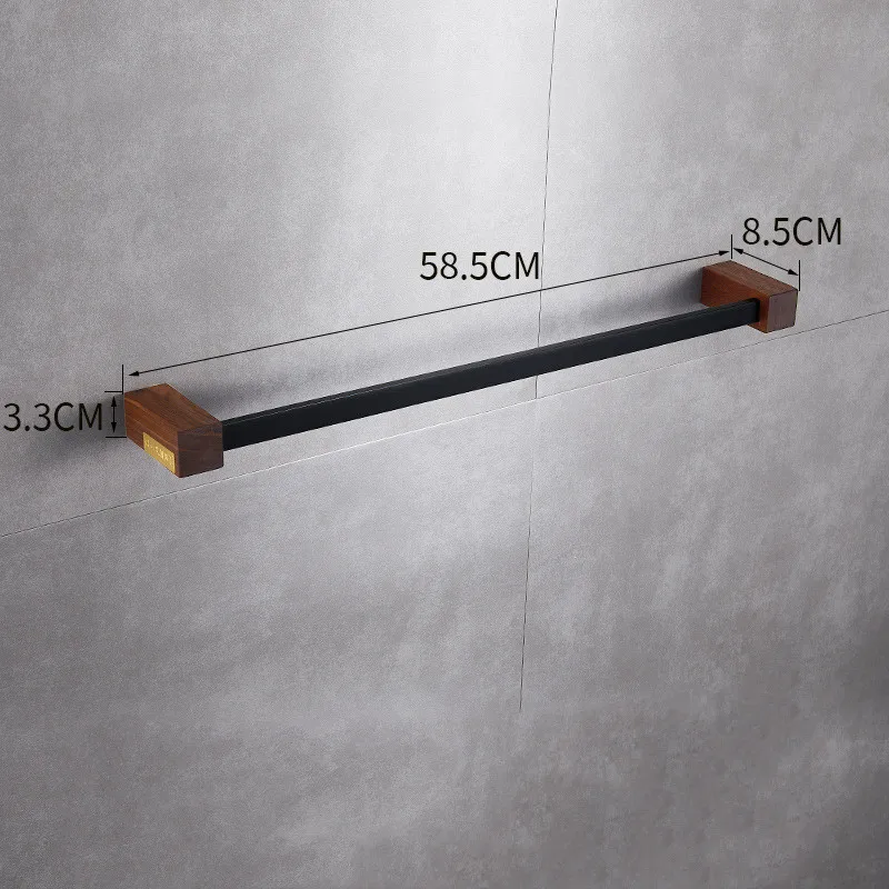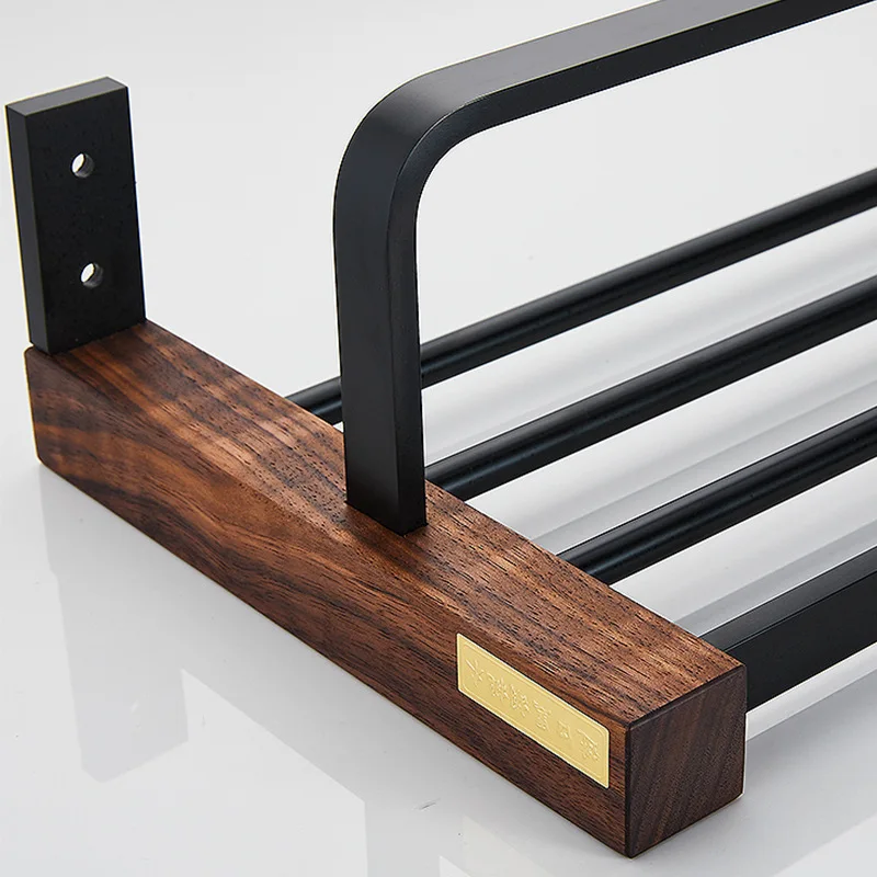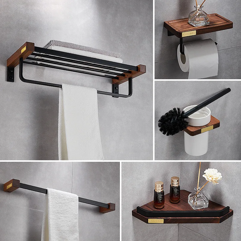 ensemble cinq pièces accessoires salle bain mural acier inox bois noyer finition noir mat style industriel contemporain fixation robuste rangement