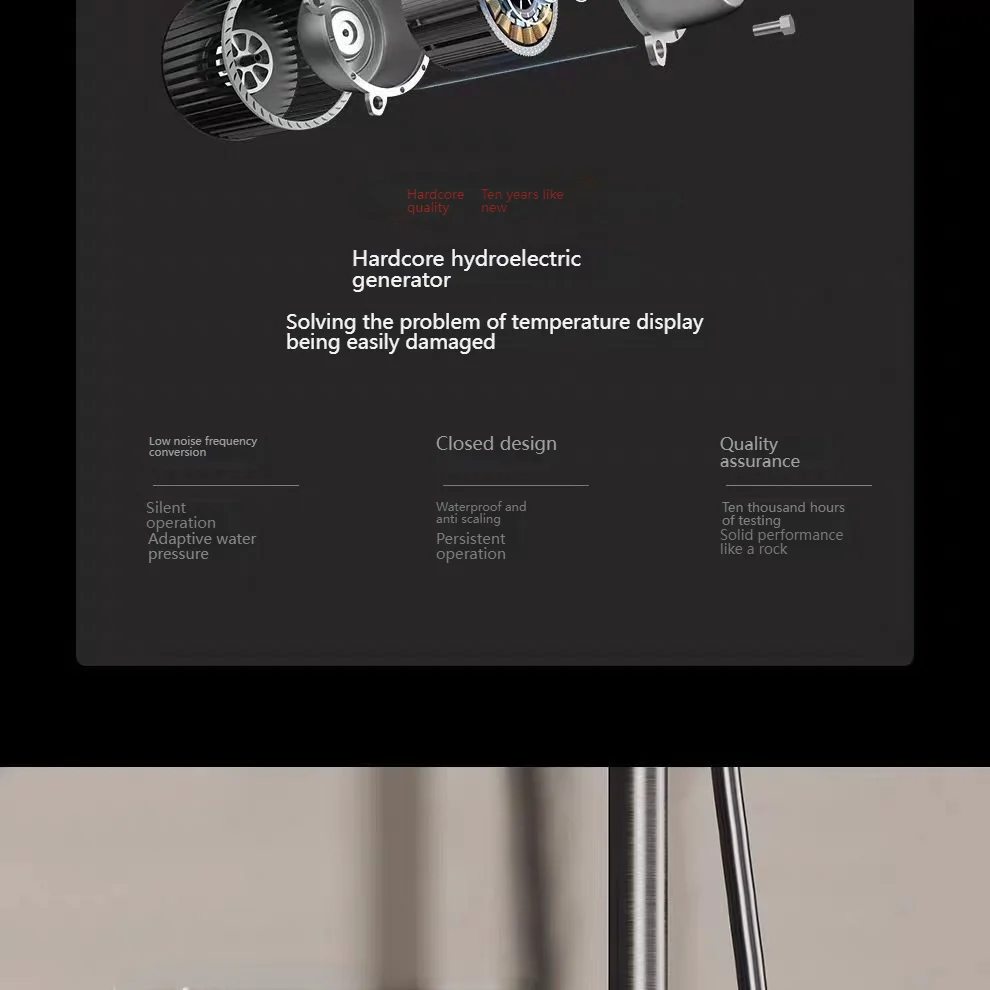 Description de l’affichage de la température de la lumière ambiante : production d’énergie du débit d’eau, micro générateur de débit d’eau intégré, pas de batterie, pas de plug-in