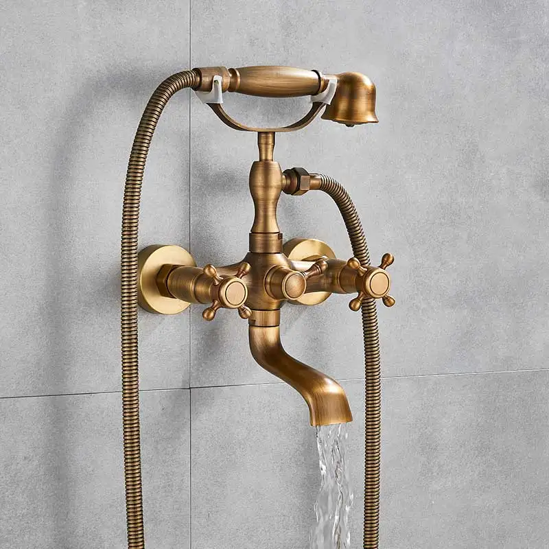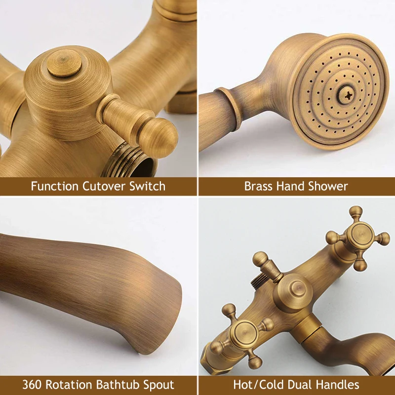 Antique Brass Bathtub Shower Faucets Set Dual Knobs Mixer Tap Wall Mounted Bath Shower Set Swivel Tub Spout Bath Shower Bathroom Brass Hand Shower Mixer Tpas
