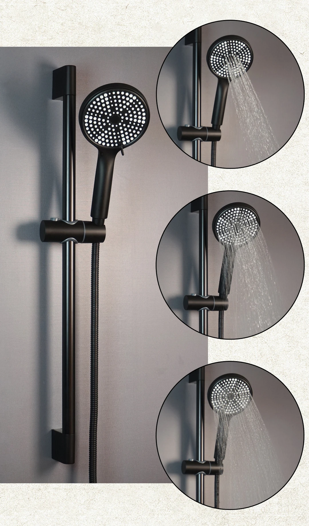 Matériel : rail coulissant en acier inoxydable + douchette à main ABS