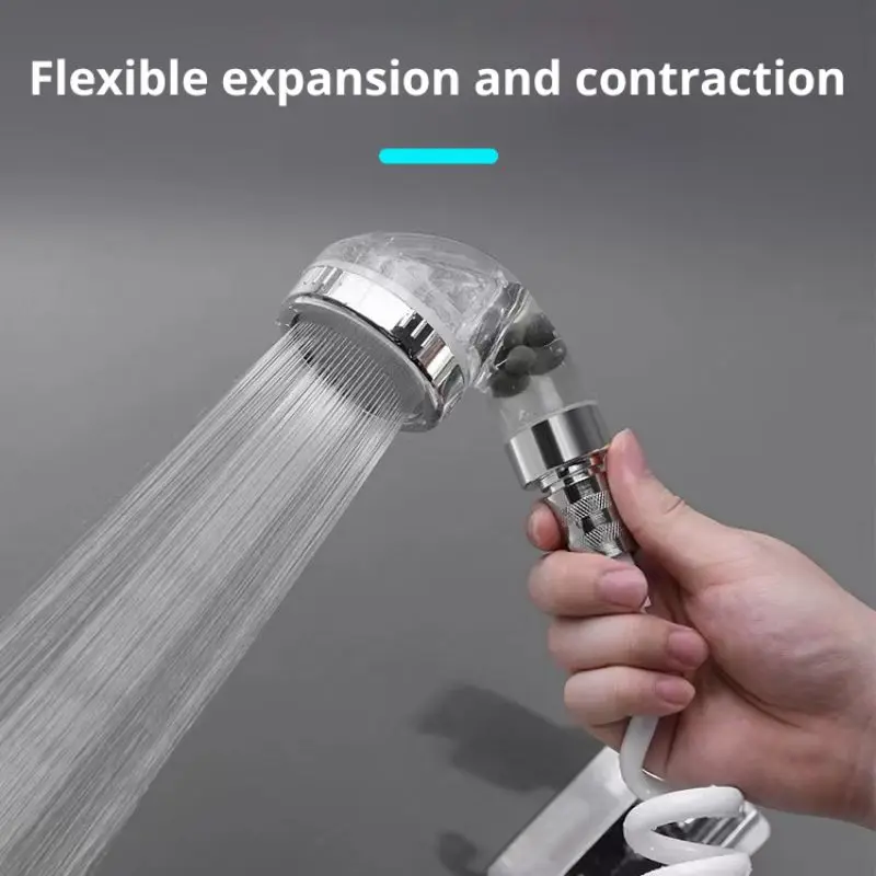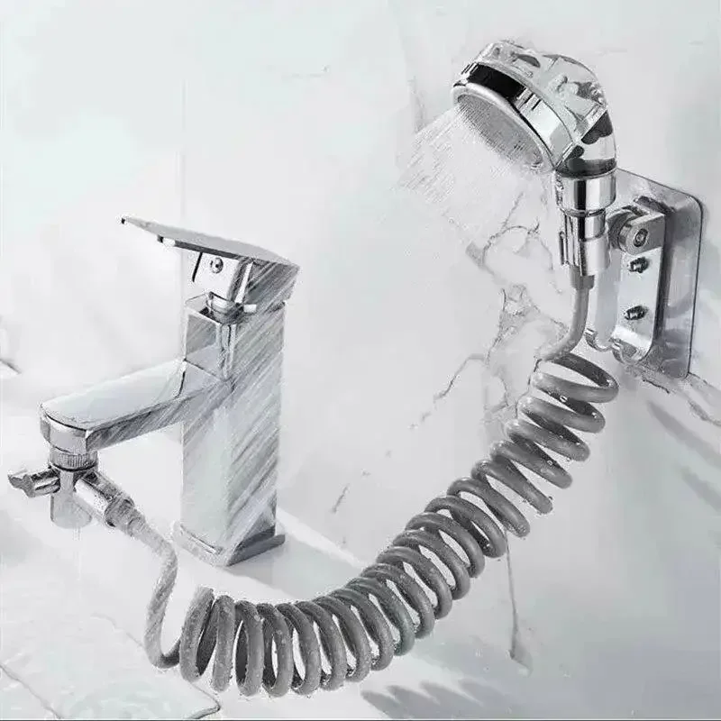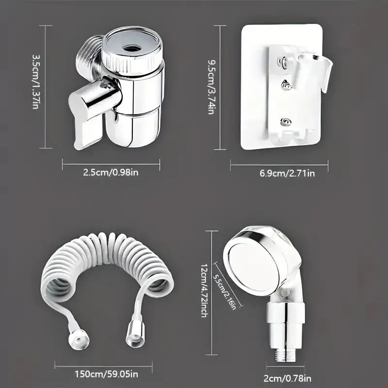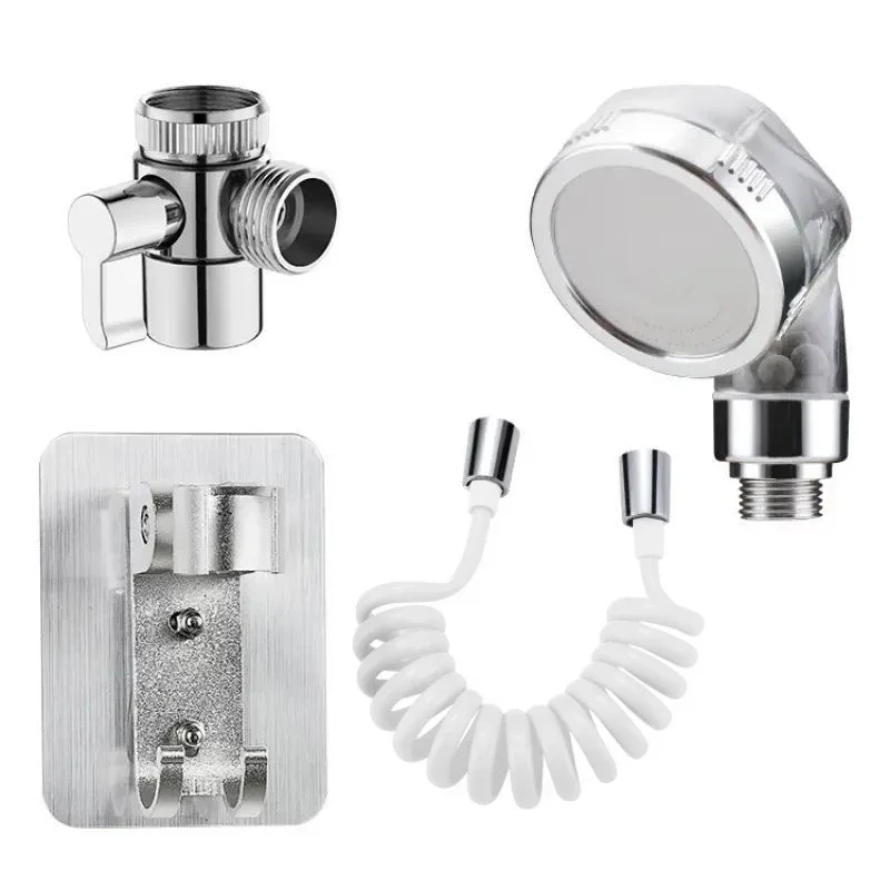 1. Rallonge de robinet avec pomme de douche, pomme de douche avec 3 clés fonctionnelles et 1 bouton d’arrêt d’eau