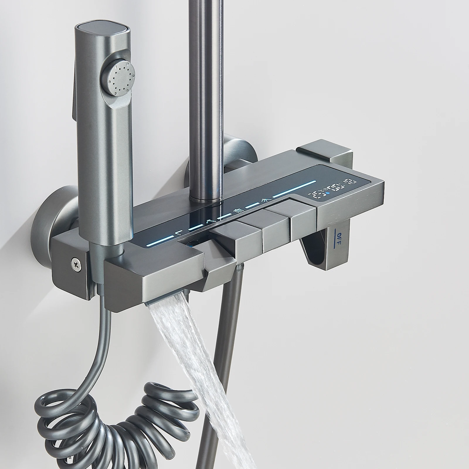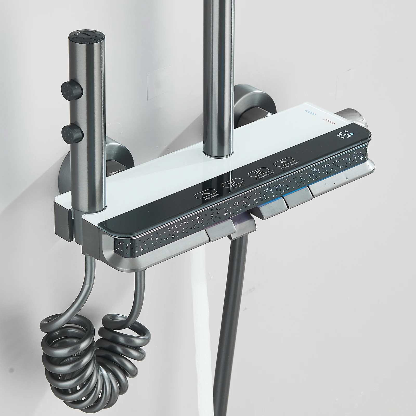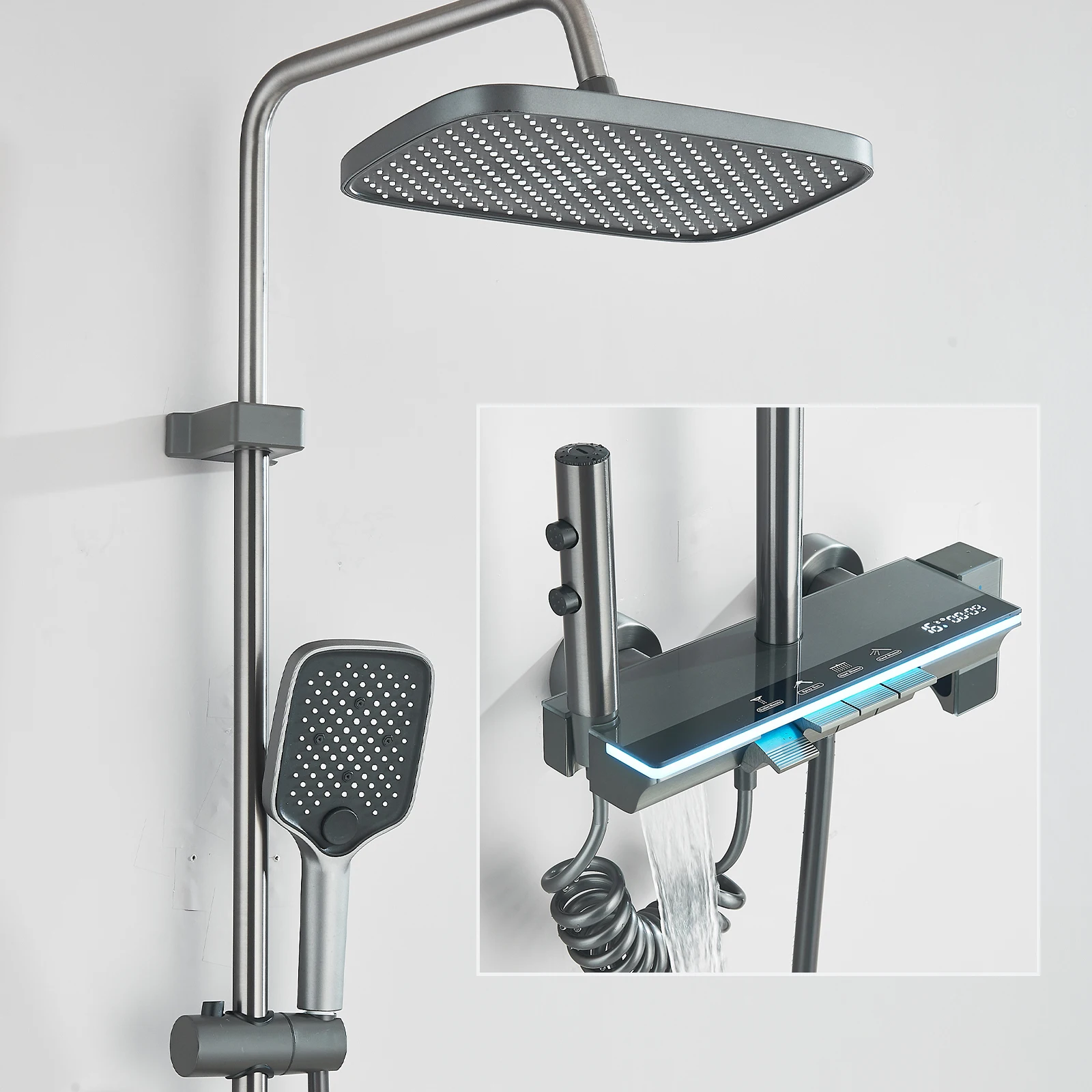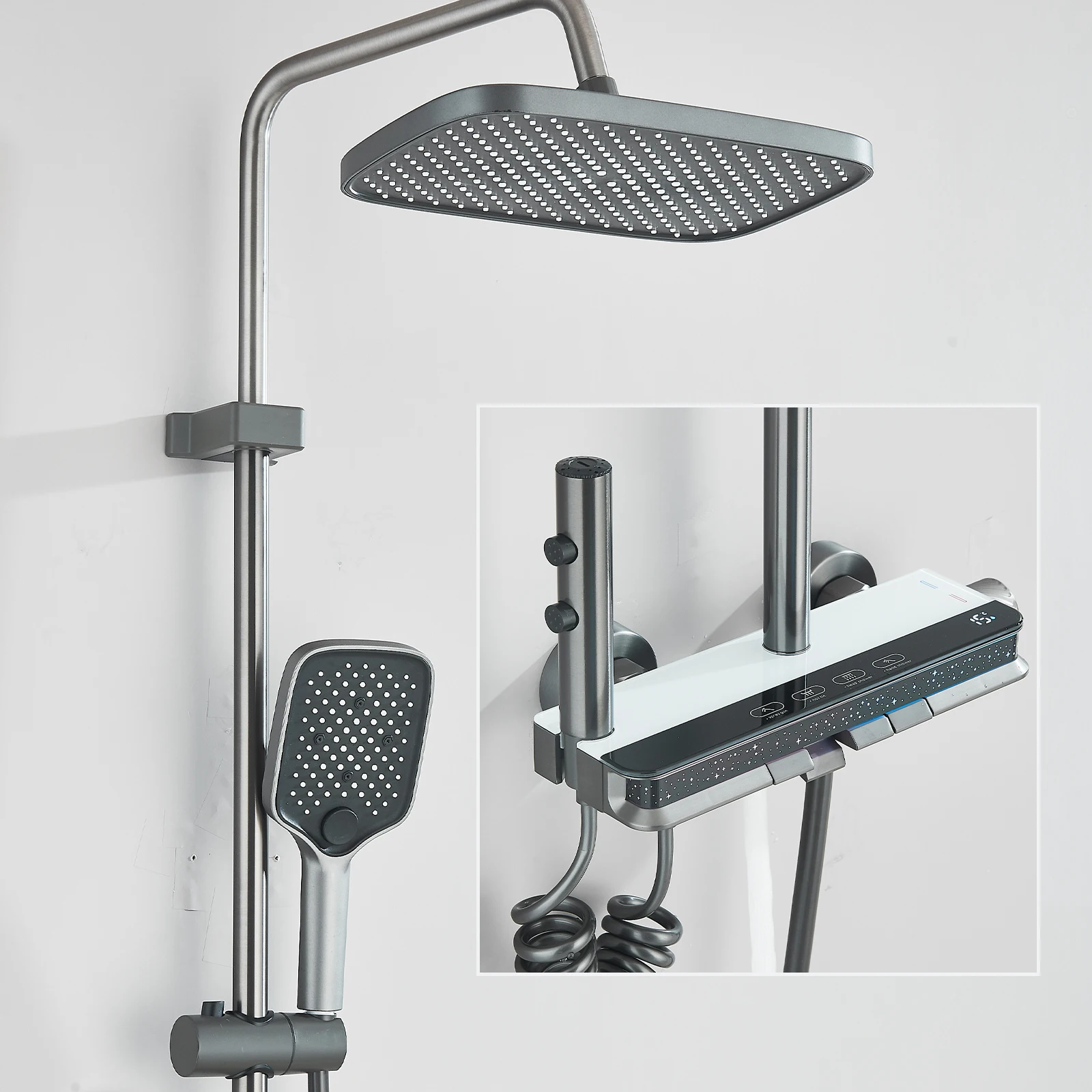 Ensemble de douche gris, système de douche à affichage numérique intelligent à quatre fonctions, ensemble de robinets de douche à clé de Piano mural pressurisé à pluie