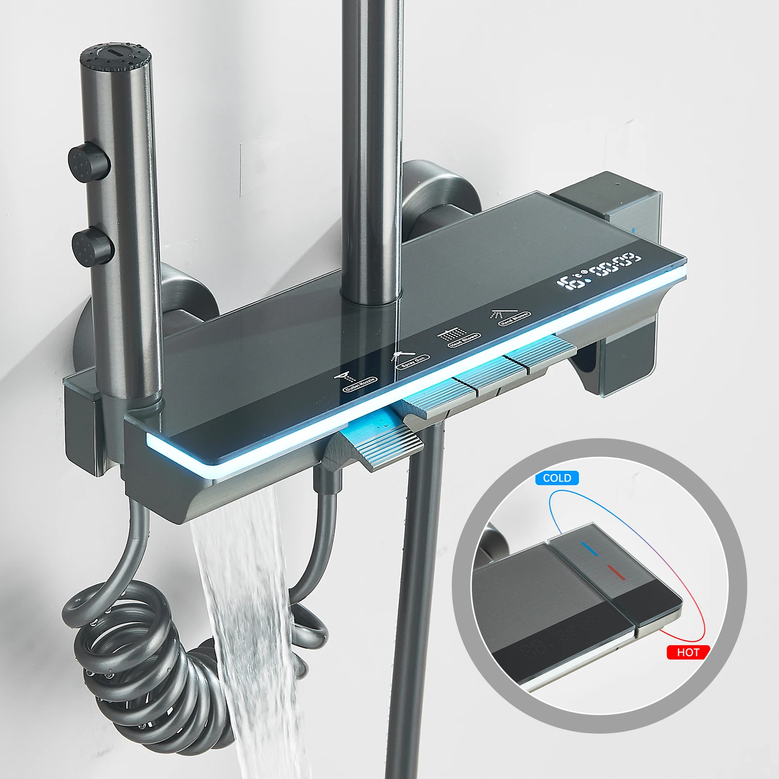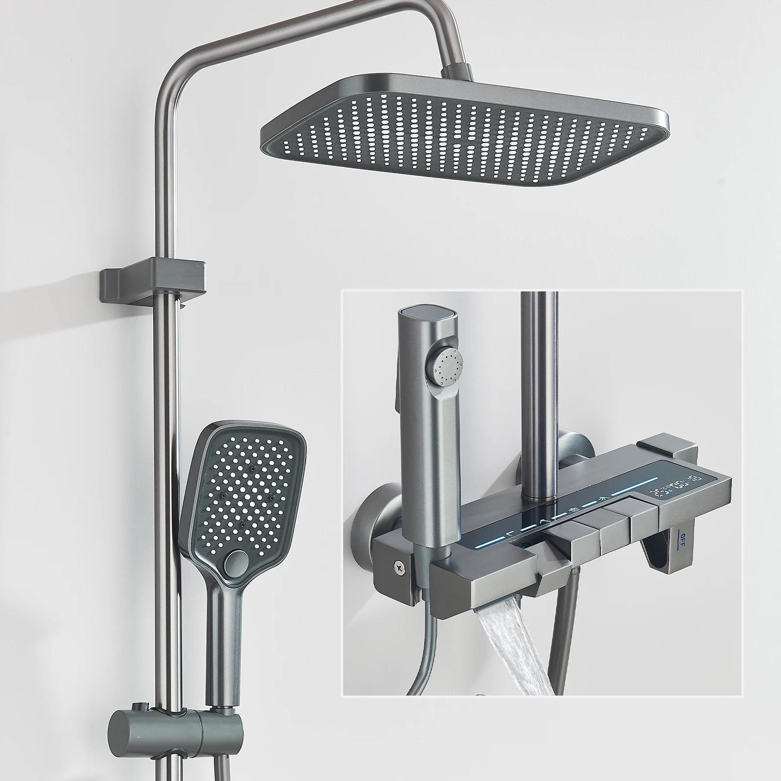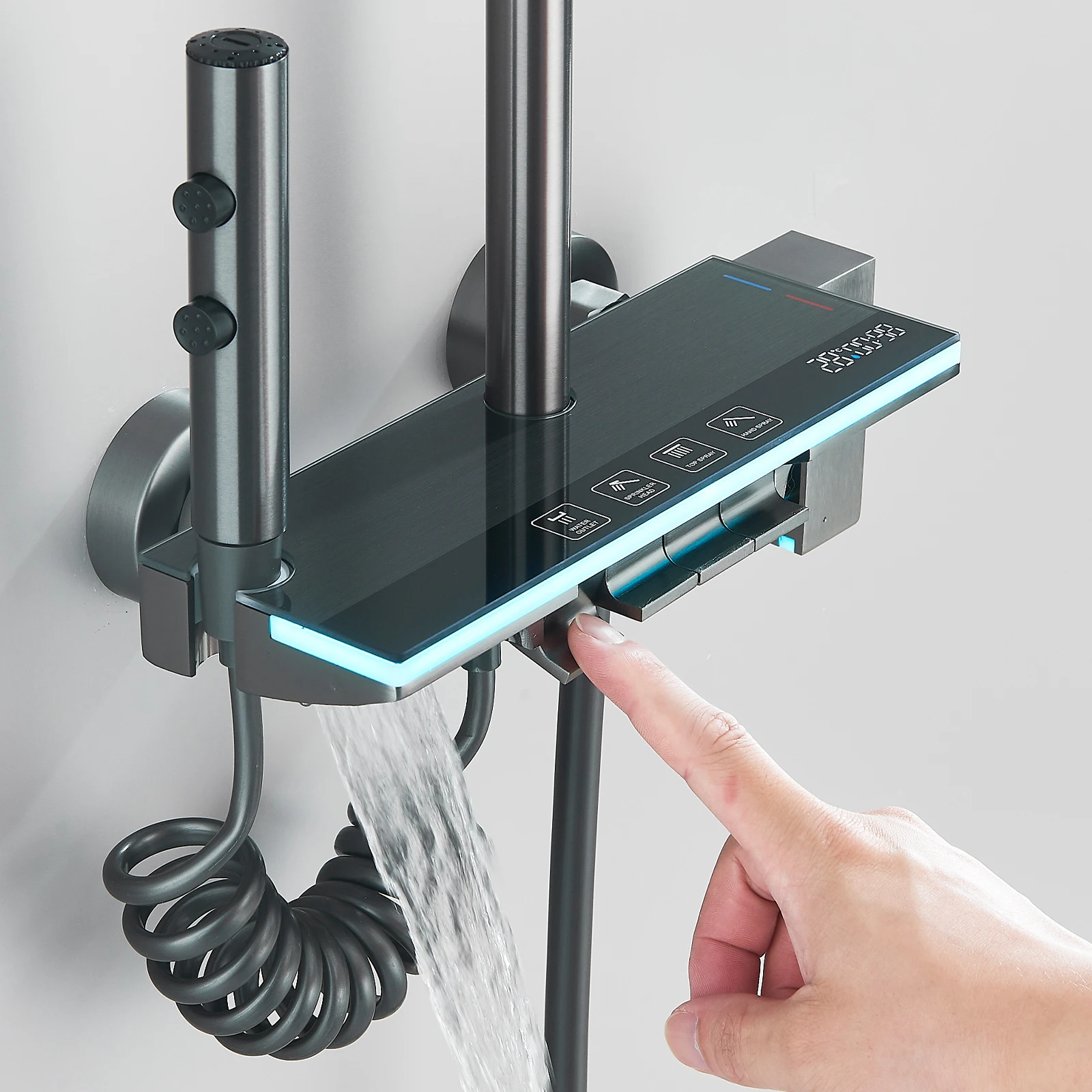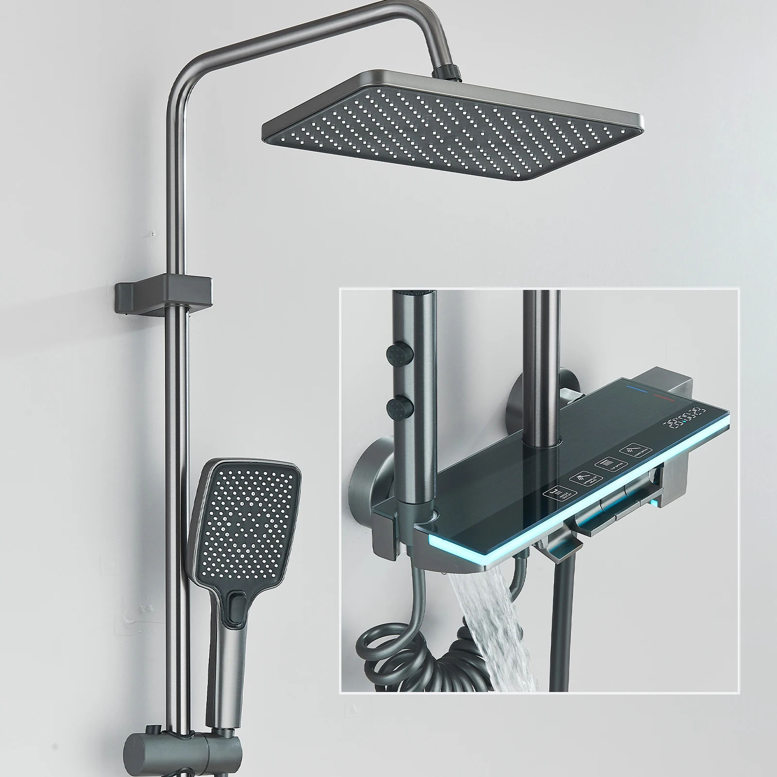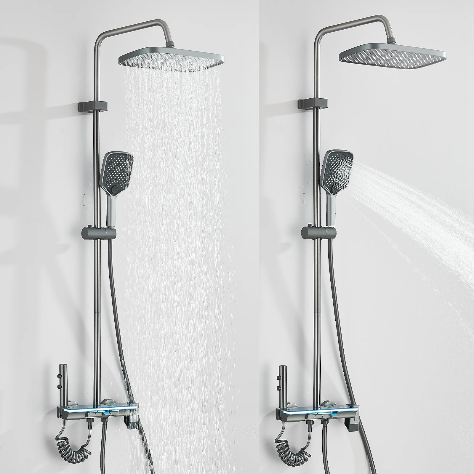 Ensemble de douche gris, système de douche à affichage numérique intelligent à quatre fonctions, ensemble de robinets de douche à clé de Piano mural pressurisé à pluie