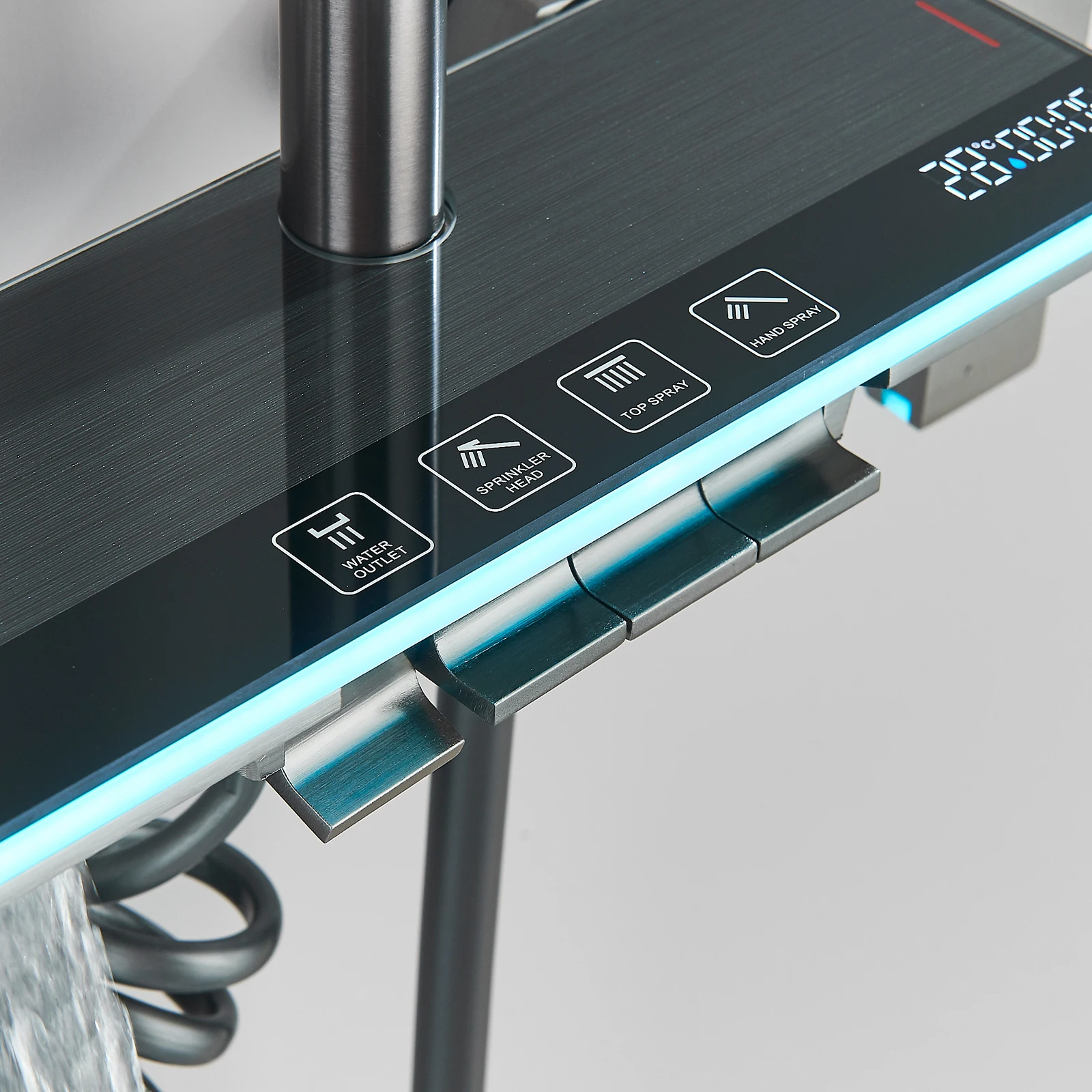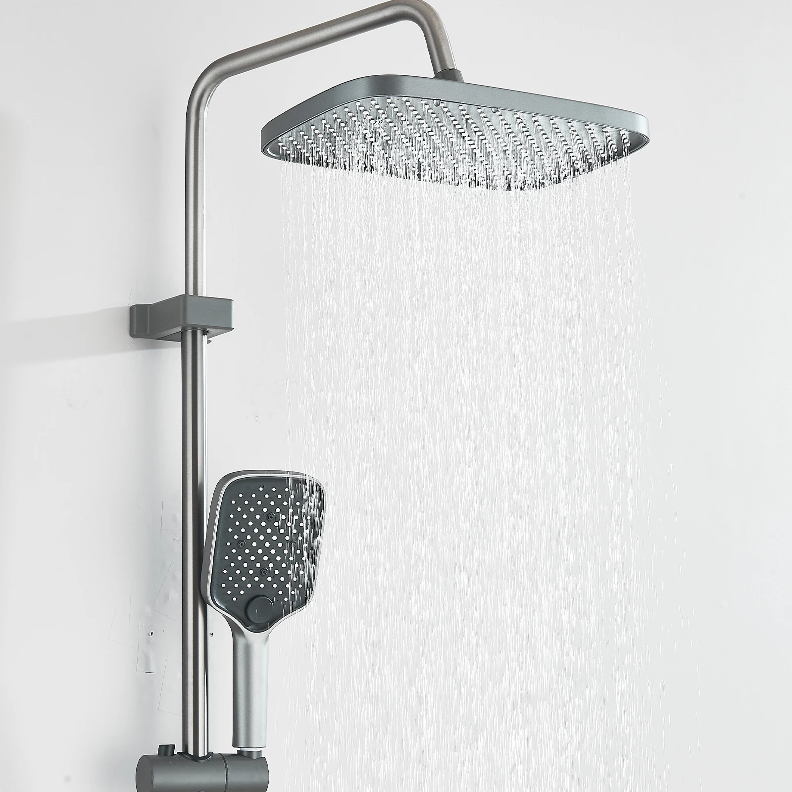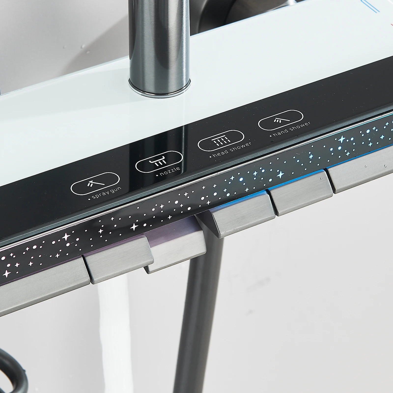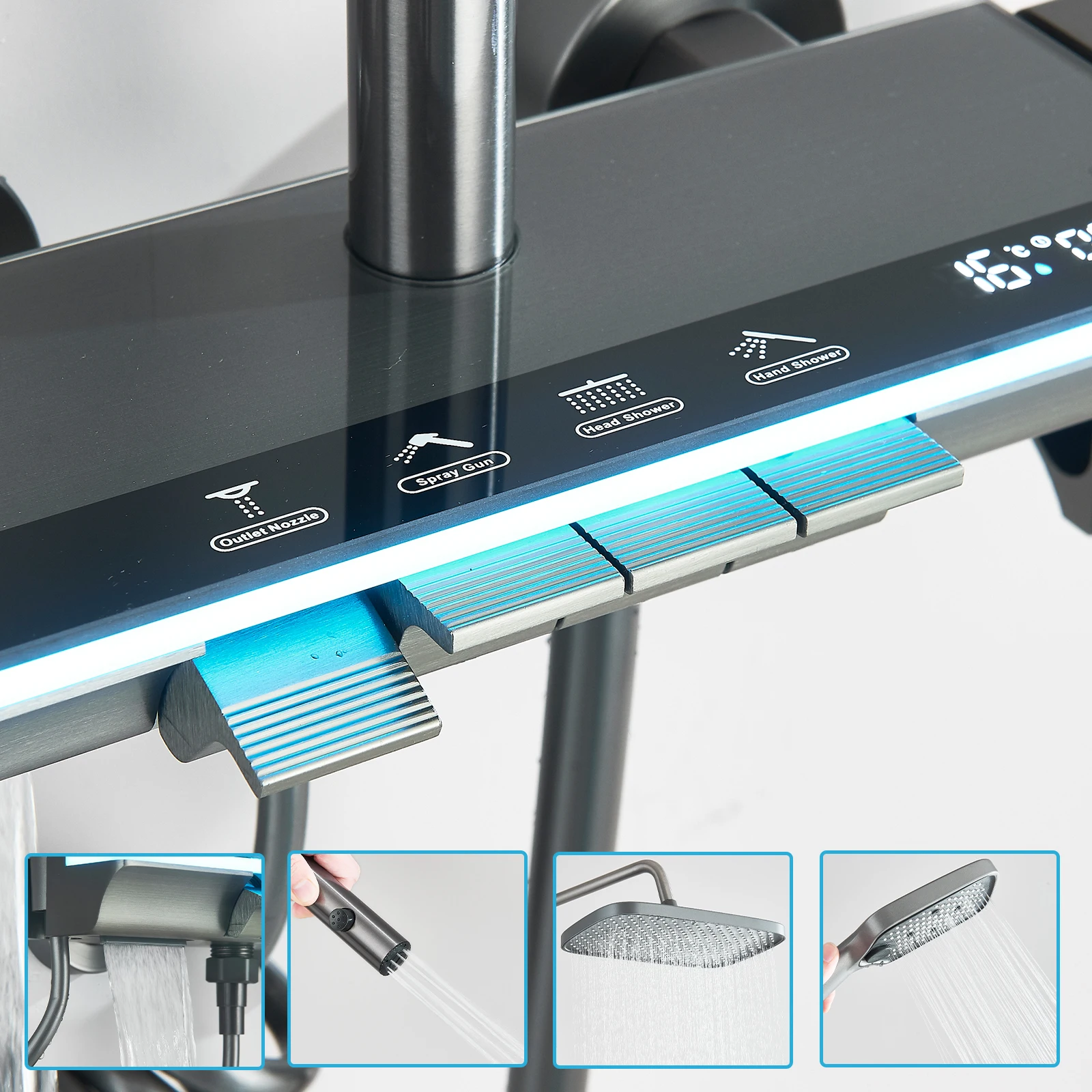 Ensemble de douche gris, système de douche à affichage numérique intelligent à quatre fonctions, ensemble de robinets de douche à clé de Piano mural pressurisé à pluie