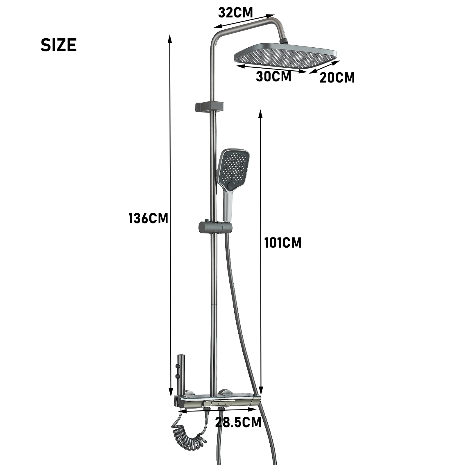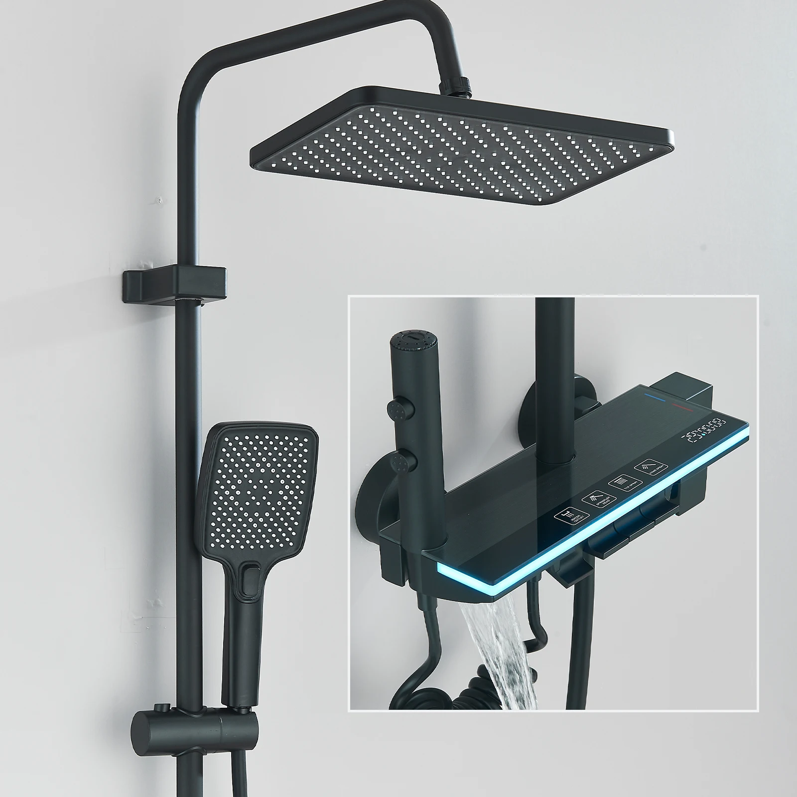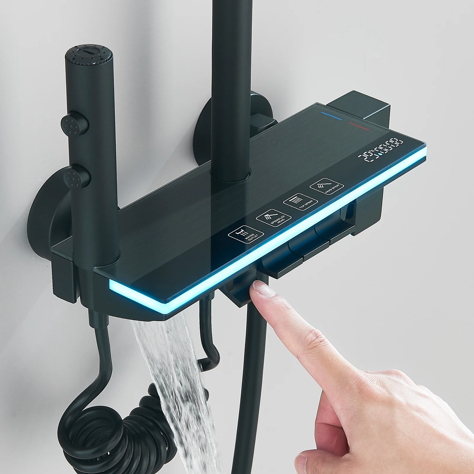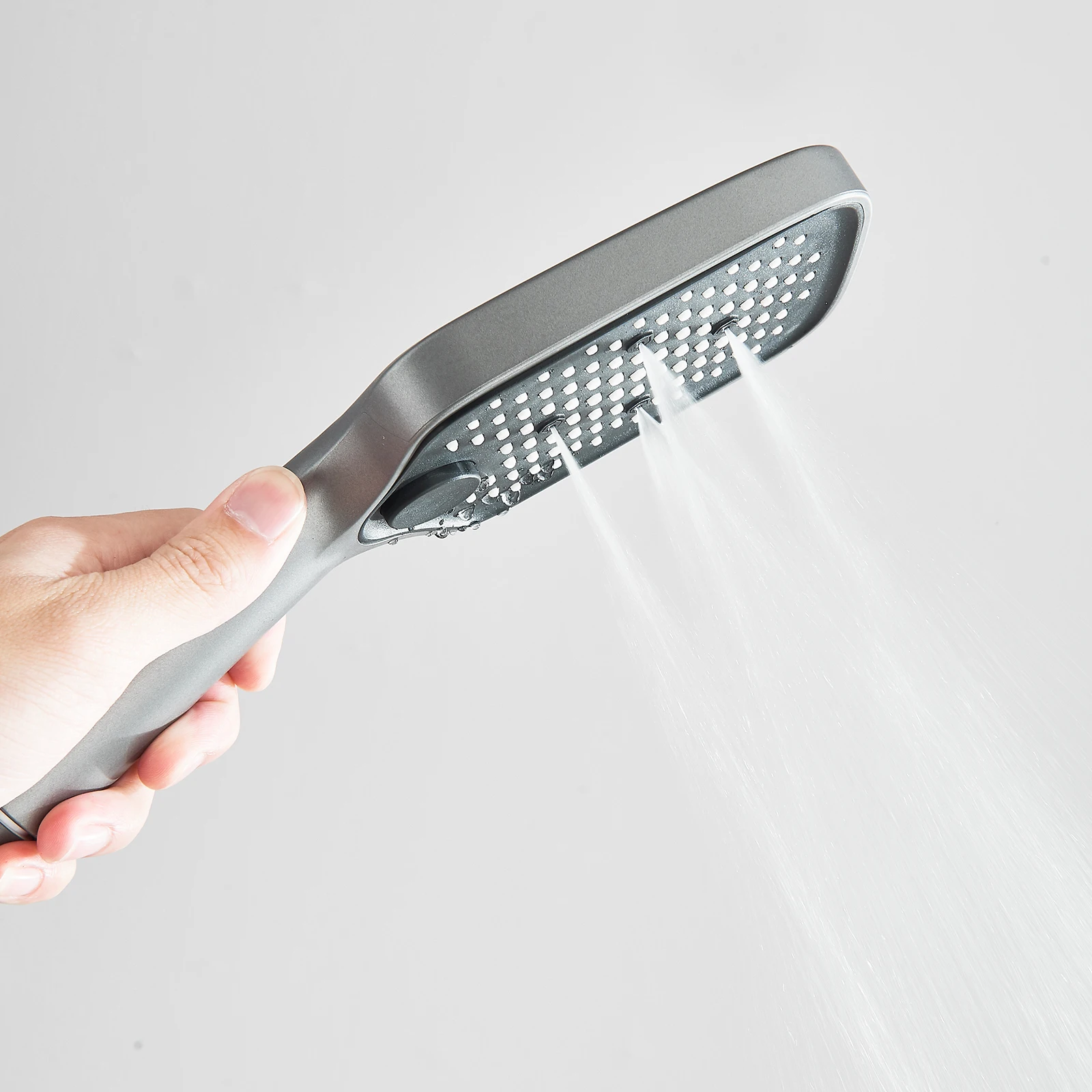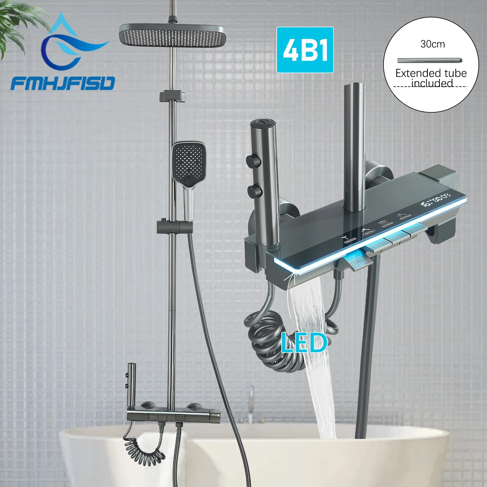 Ensemble de douche gris, système de douche à affichage numérique intelligent à quatre fonctions, ensemble de robinets de douche à clé de Piano mural pressurisé à pluie