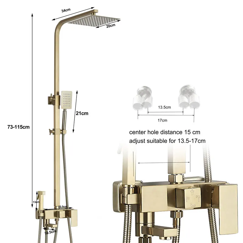 Ensemble de robinets de douche dorés, robinet de baignoire à 3/4 voies avec étagère de salle de bains, réglage de la hauteur, grue mélangeur en laiton, systèmes d’eau chaude et froide