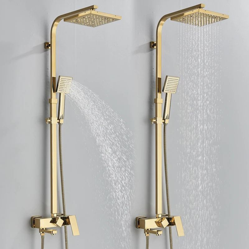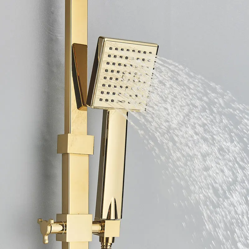 Ensemble de robinets de douche dorés, robinet de baignoire à 3/4 voies avec étagère de salle de bains, réglage de la hauteur, grue mélangeur en laiton, systèmes d'eau chaude et froide