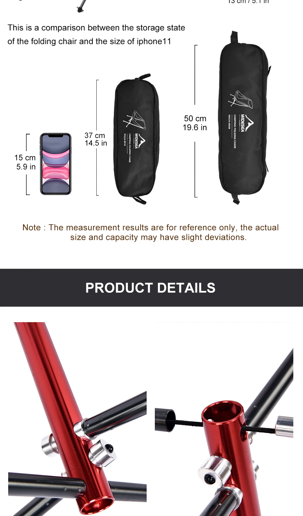 • Utilisation polyvalente :Cette chaise est parfaite pour une variété d’activités de plein air telles que le camping, la pêche et les pique-niques, ce qui en fait un ajout polyvalent à votre équipement de voyage.