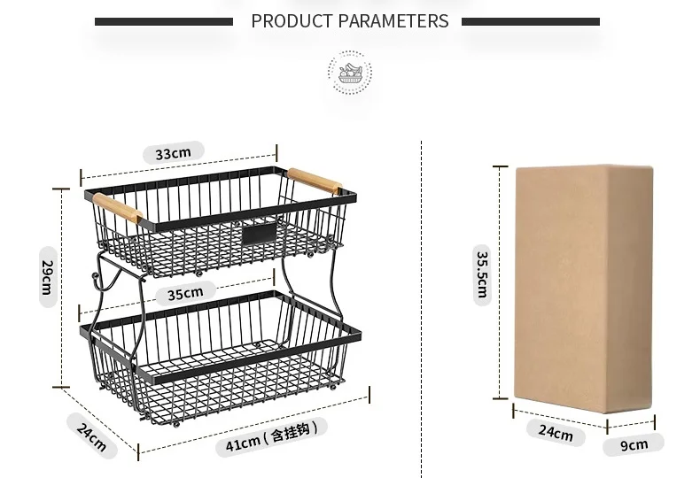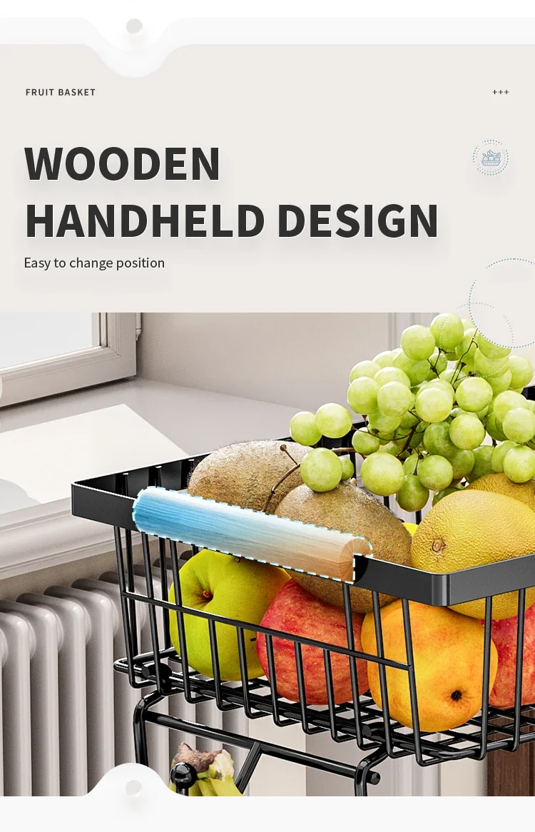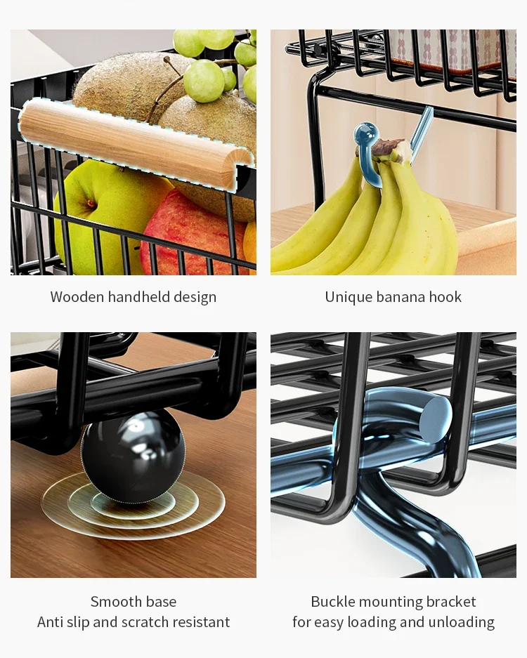 Matériau robuste et structure stable : en fer forgé antirouille avec un revêtement en poudre noire classique.Chaque panier a 4 pieds circulaires pour garder les fruits loin du bureau sale et fournir un excellent support équilibré.Les poignées portables en bois conçues pour un transport facile.